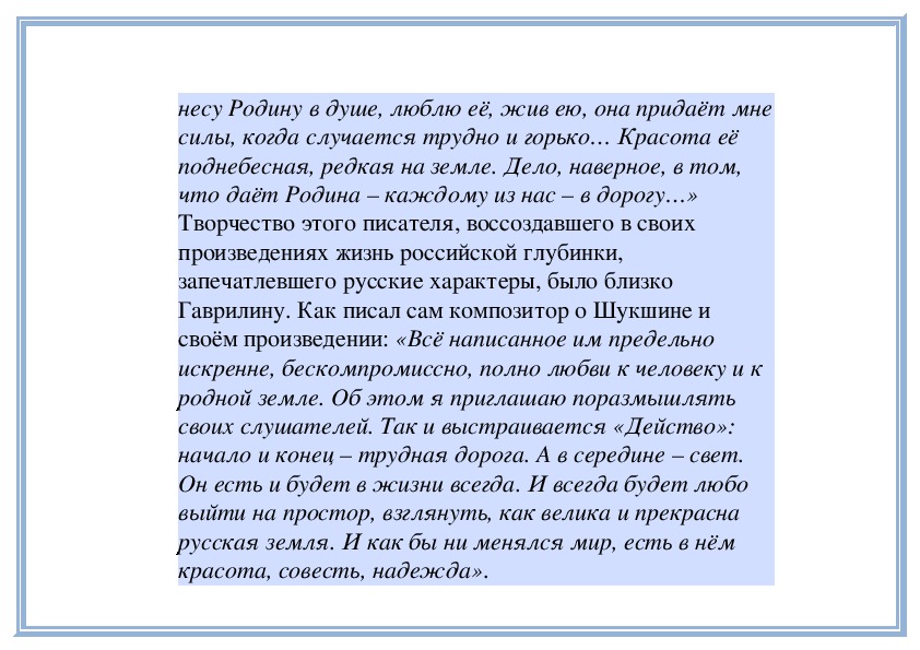 живёт во мне. Дороже у меня ничего нет… Всю жизньнесу Родину в душе, люблю её, жив ею, она придаёт мне