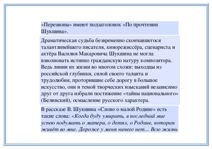 В рассказе В. Шукшина «Слово о малой Родине» есть