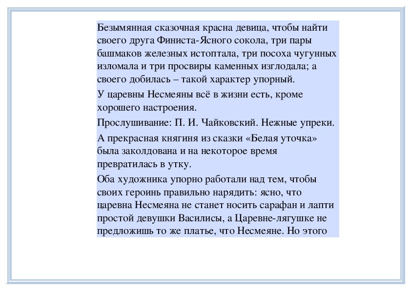 предложишь то же платье, что Несмеяне. Но этогомало: надо было показать зрителям, как выглядят