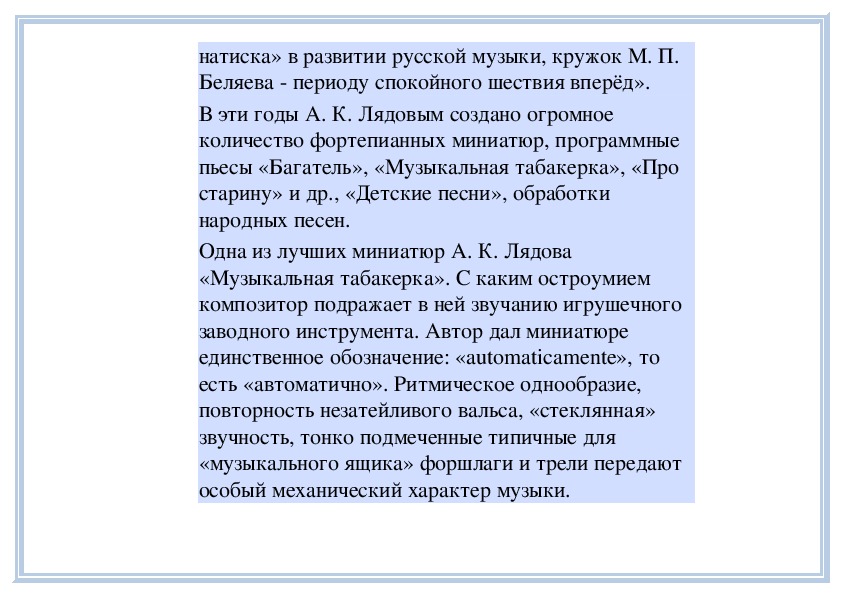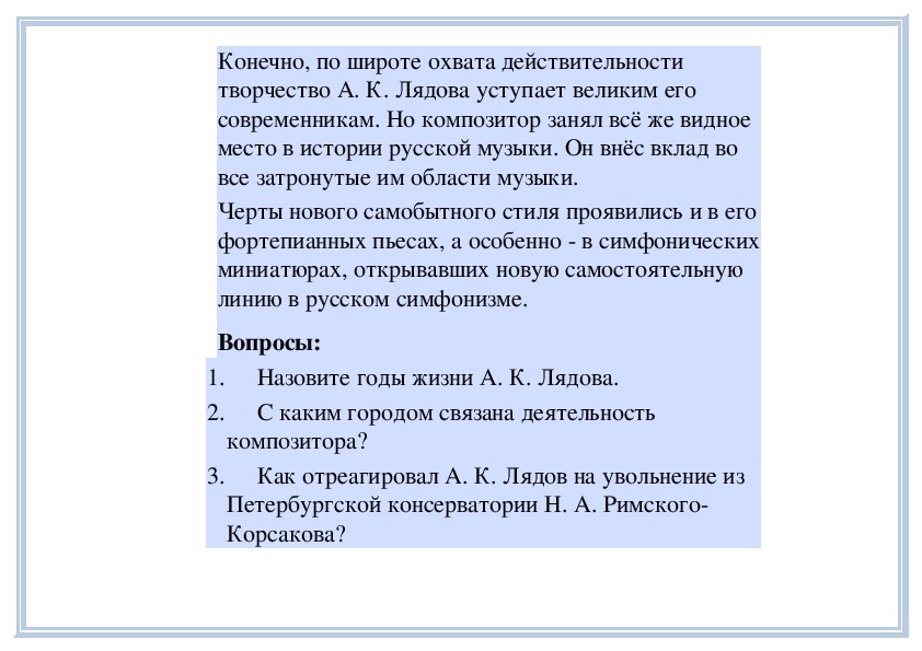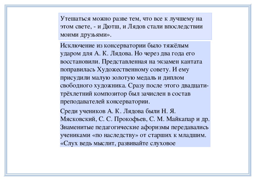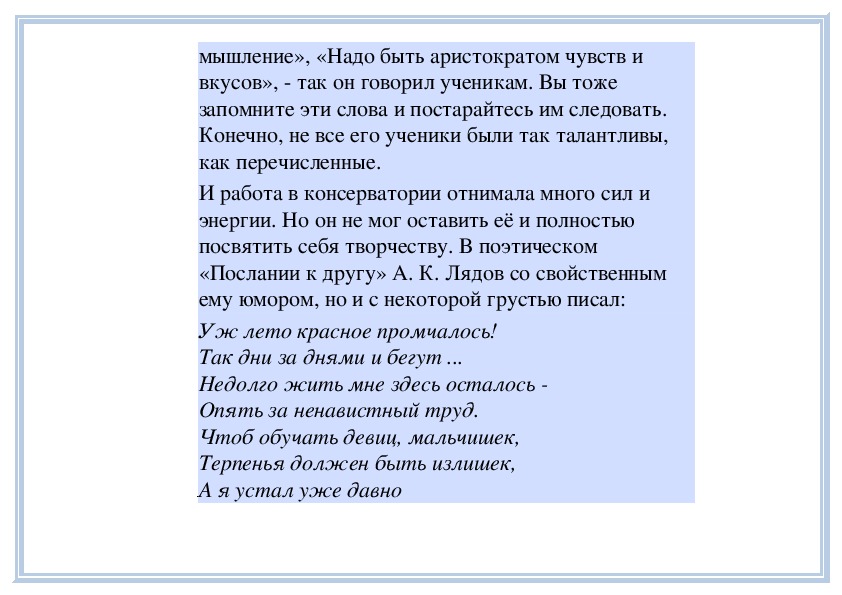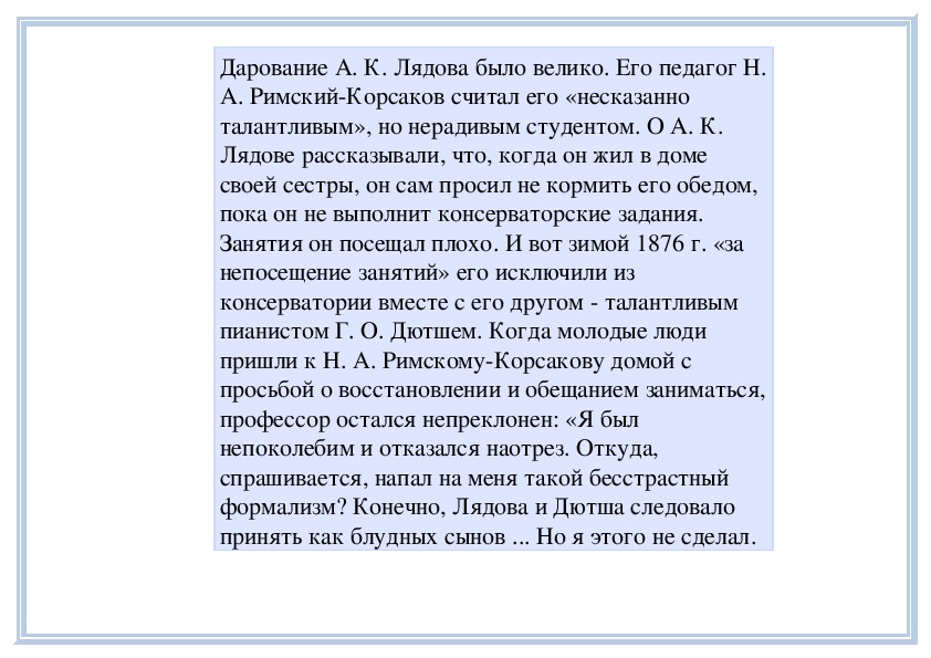 консерватории не было гладким.Дарование А. К. Лядова было велико. Его педагог Н.