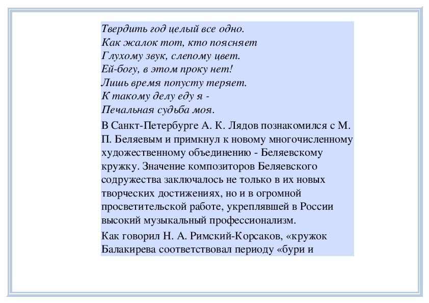 Балакирева соответствовал периоду «бури инатиска» в развитии русской музыки, кружок М. П.
