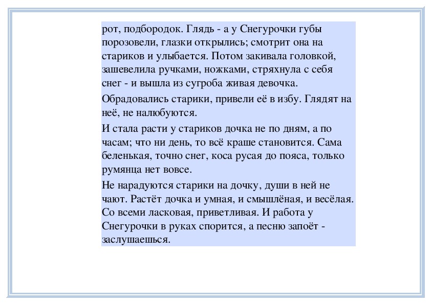 И стала расти у стариков дочка не по дням, а по часам; что ни день, то всё краше становится. Сама беленькая, точно снег, коса русая до пояса, только румянца нет вовсе.