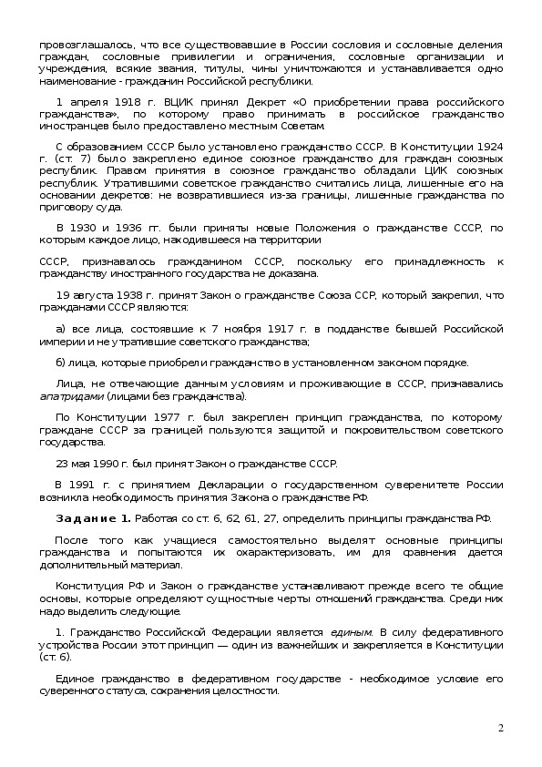 Задание 1. Работая со ст. 6, 62, 61, 27, определить принципы гражданства РФ.