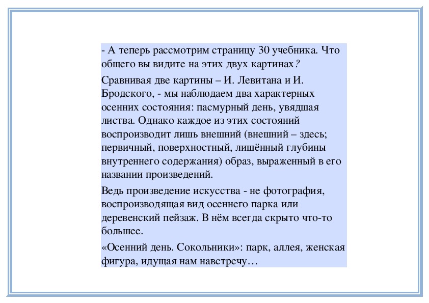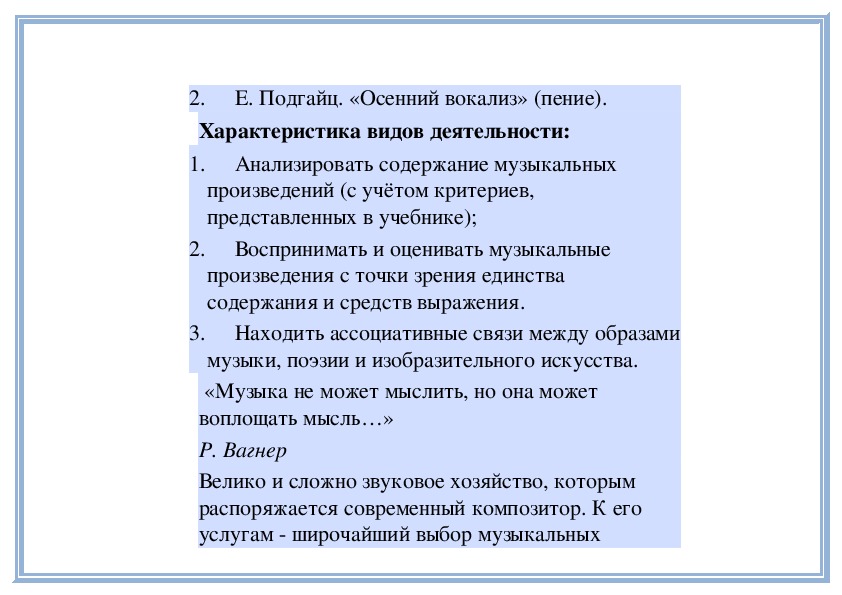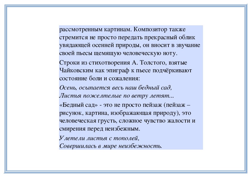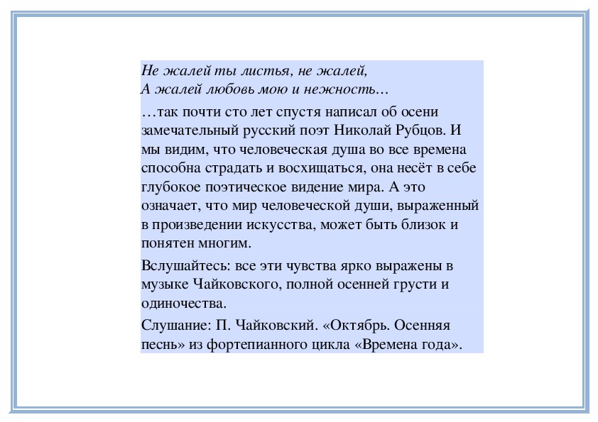 1. П. И. Чайковский. «Октябрь. Осенняя песнь» (из фортепианного цикла «Времена года», слушание);