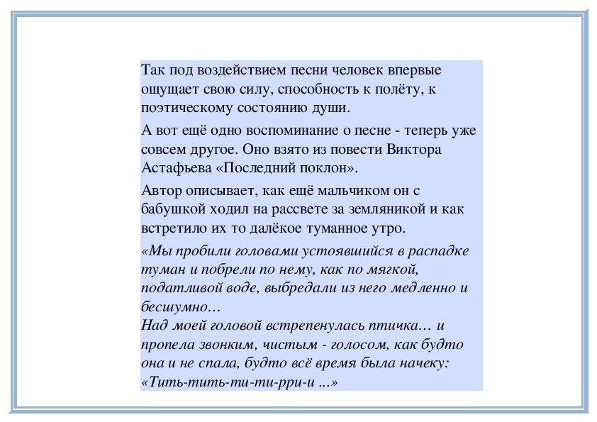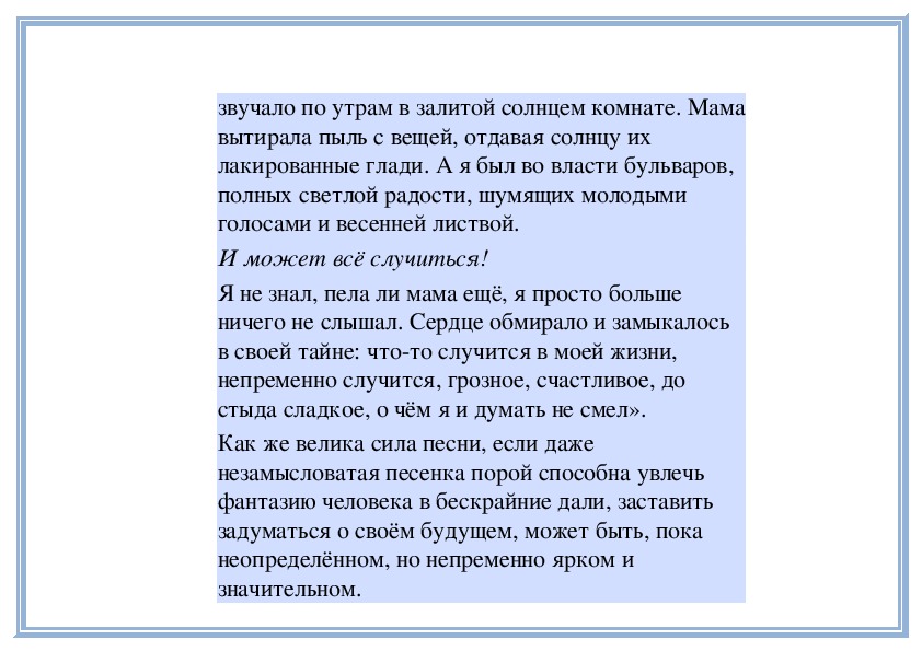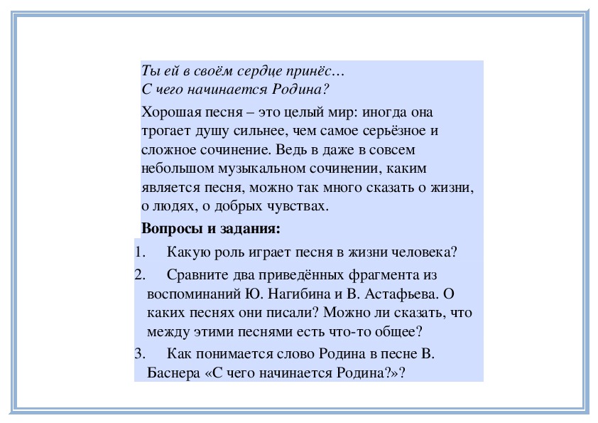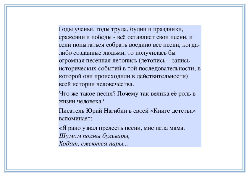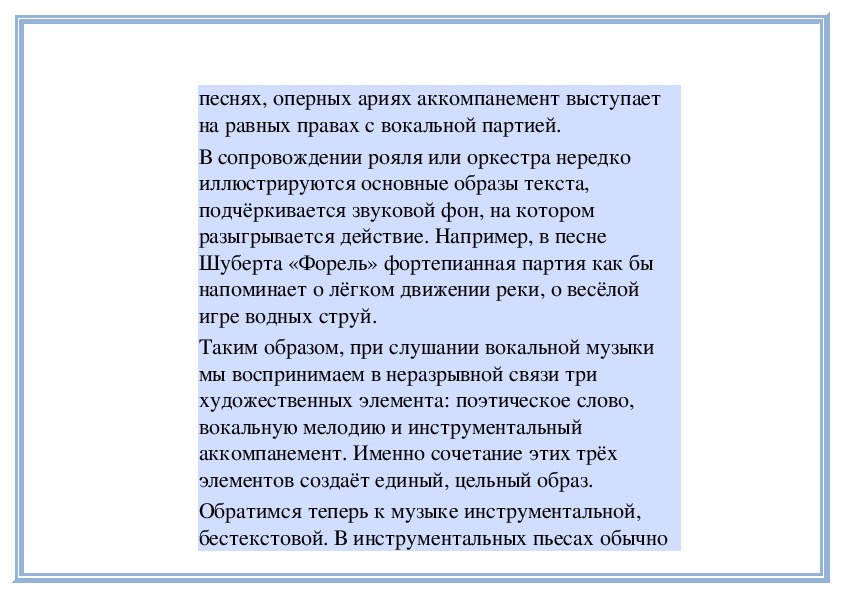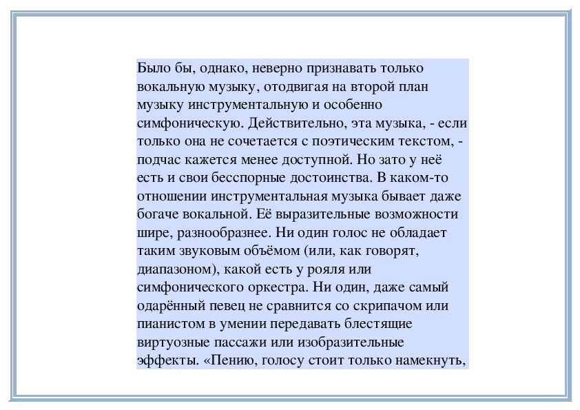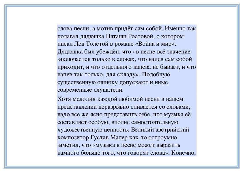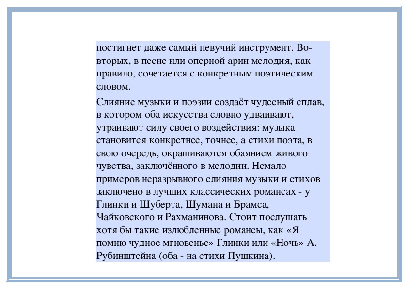Песни, романсы, оперы на протяжении многих веков были для музыкантов подлинной школой композиторского мастерства. Они учили искать вдохновение в поэзии, чутко вслушиваться в каждый стих, чтобы передать в музыке все движения чувств, все оттенки смысла, не всегда доступные словесному выражению.