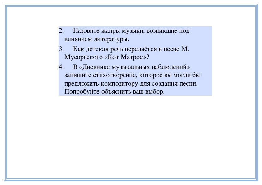 1. Воспринимать и выявлять внутренние связи между музыкой и литературой.