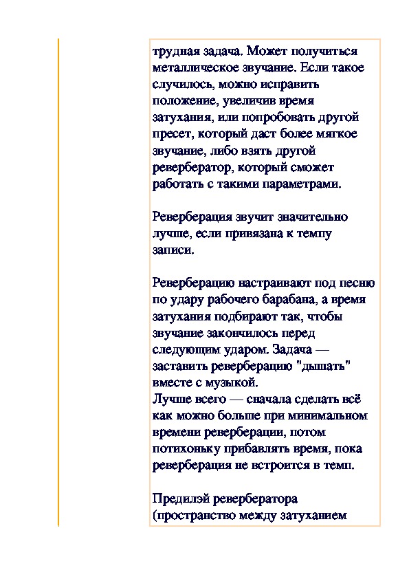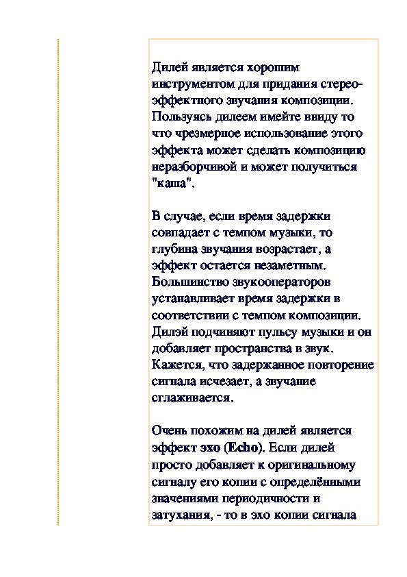 Дилей (Delay) - эффект, который добавляет к оригинальному сигналу его копии с временной задержкой (больше 0.5 сек), с определённой вами периодичностью повторений (обычно кратной темпу) и затуханием амплитуды.