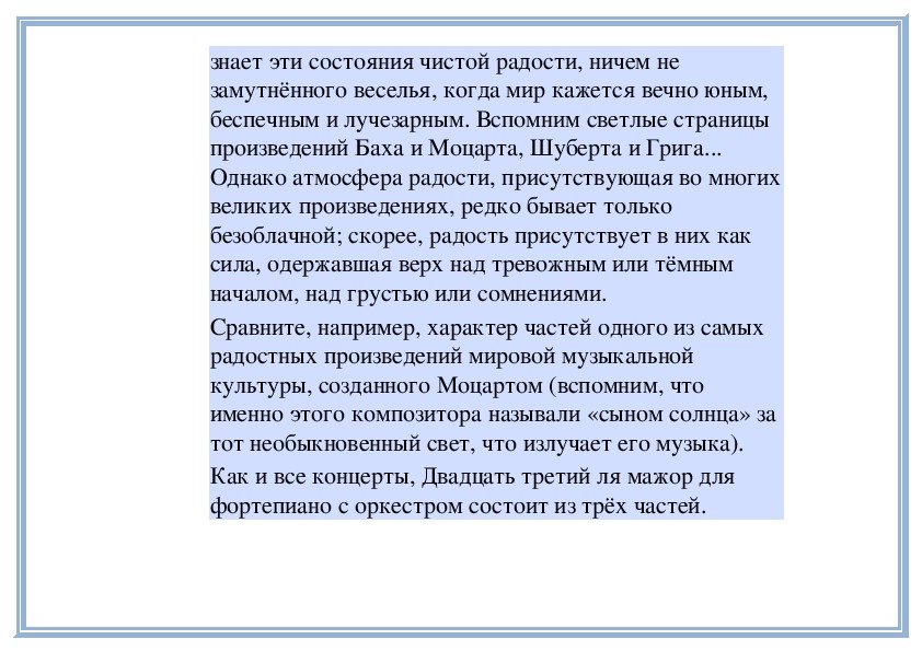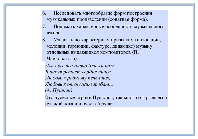 8. Узнавать по характерным признакам (интонации, мелодии, гармонии, фактуре, динамике) музыку отдельных выдающихся композиторов (П. Чайковского).