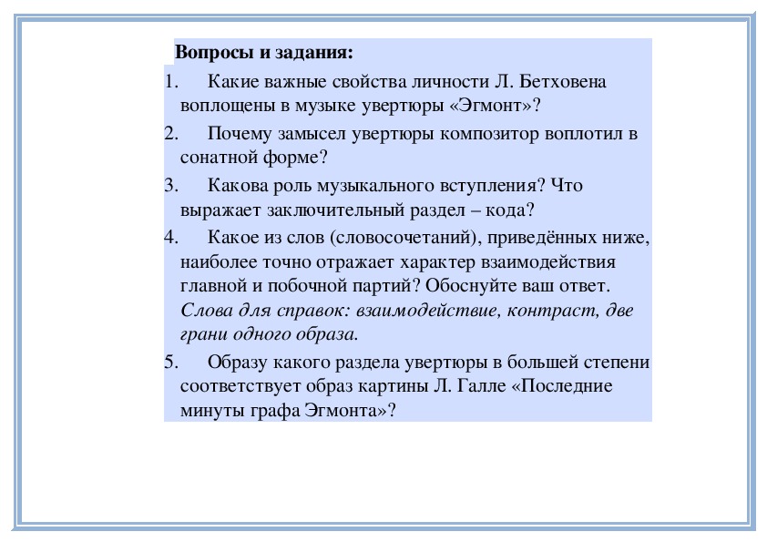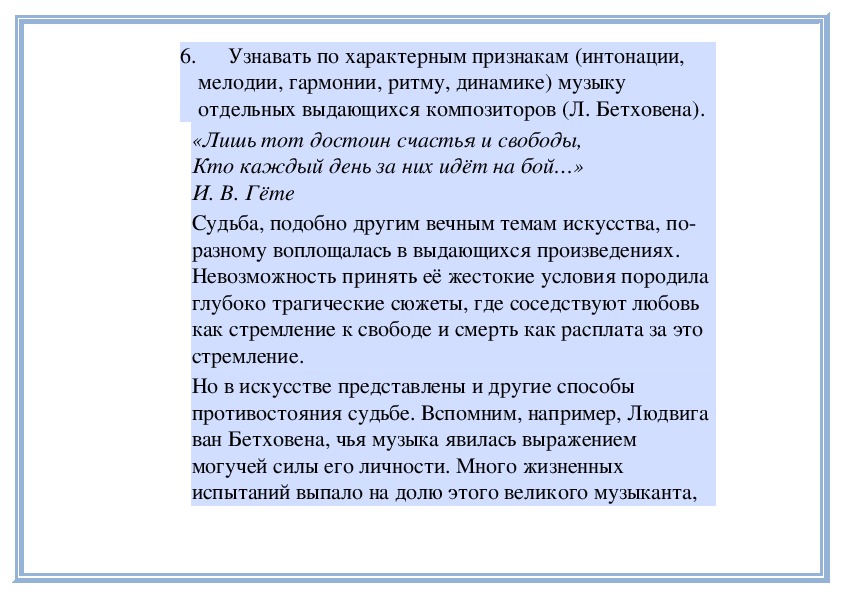 5. Воспринимать особенности интонационного и драматургического развития в произведениях сложных форм.