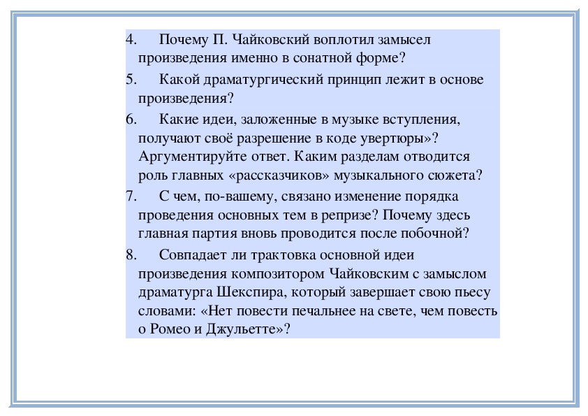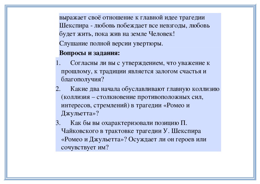 1. П. Чайковский. Увертюра-фантазия «Ромео и Джульетта» (слушание);