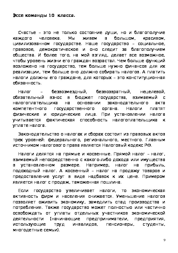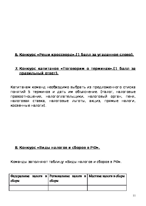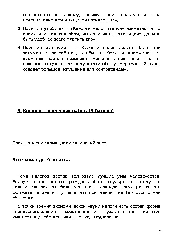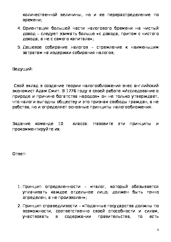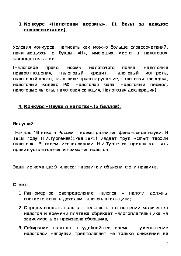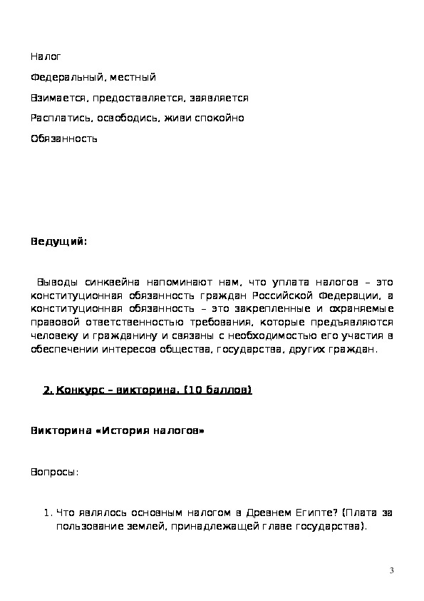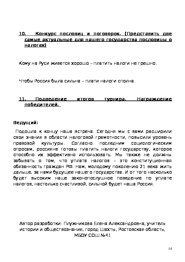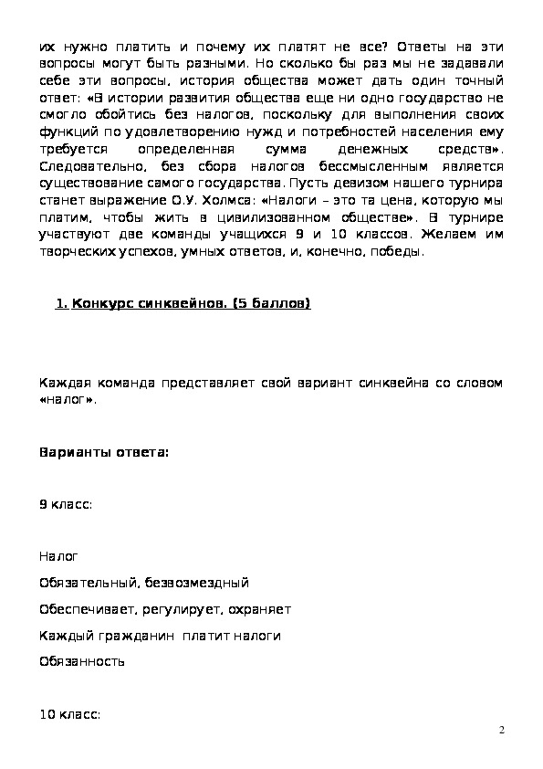 Урок разработан в игровой форме, содержит творческие работы учащихся, может быть использован как на уроке, так и во внеклассной работе по предмету.Наша встреча, уважаемые участники турнира, посвящена теме «Налоги». Современный мир, цивилизованное общество, человеческий опыт, на сегодняшний день не знает более эффективного способа собирания государством денежных средств, чем налоги. В любом государстве налоги составляют большую часть доходов государственного бюджета. Налоги и сборы: почему их нужно платить и почему их платят не все? Ответы на эти вопросы могут быть разными. Но сколько бы раз мы не задавали себе эти вопросы, история общества может дать один точный ответ: «В истории развития общества еще ни одно государство не смогло обойтись без налогов, поскольку для выполнения своих функций по удовлетворению нужд и потребностей населения ему требуется определенная сумма денежных средств». Следовательно, без сбора налогов бессмысленным является существование самого государства. Пусть девизом нашего турнира станет выражение О.У. Холмса: «Налоги – это та цена, которую мы платим, чтобы жить в цивилизованном обществе». В турнире участвуют две команды учащихся 9 и 10 классов. Желаем им творческих успехов, умных ответов, и, конечно, победы.