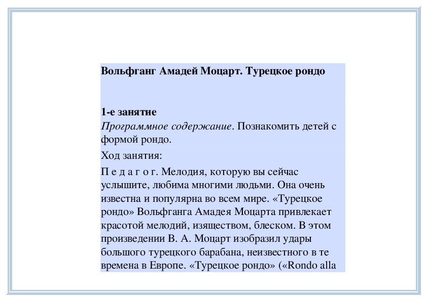 П е д а г о г. Вы много раз слышали 40-ю симфонию В. А. Моцарта. Наверняка эта музыка нравится вам. Она очень красивая, душевная, трепетная. Недавно вы познакомились с сонатой ре мажор Й. Гайдна. Симфония - эта та же соната, но написанная для оркестра. В ней несколько частей, чаще всего четыре. Первая часть, как и соната, пишется в сонатной форме: состоит из трёх разделов (экспозиции, разработки и репризы).