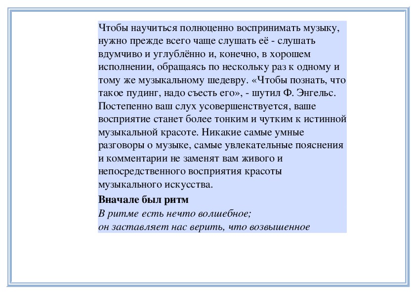 1. Эмоционально воспринимать художественные образы различных видов искусства.