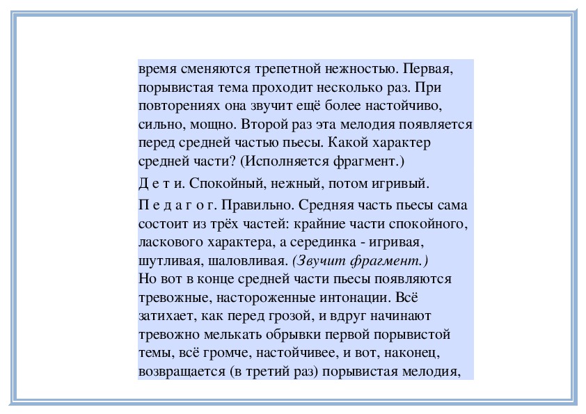 волевые интонации сменяются нежными,лёгкими. (Звучит третья часть, потом вся пьеса
