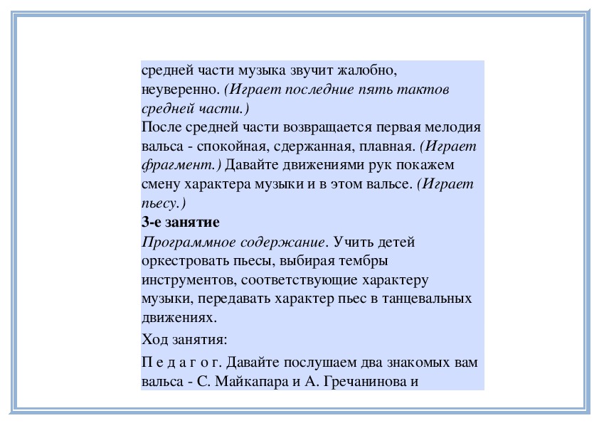 П е д а г о г. Я сыграю вам пьесу С. Майкапара «Вальс». Вальс - это танец, который танцуют кружась (быстро, стремительно или более медленно, плавно, спокойно). Как звучит этот вальс? (Исполняет пьесу.)