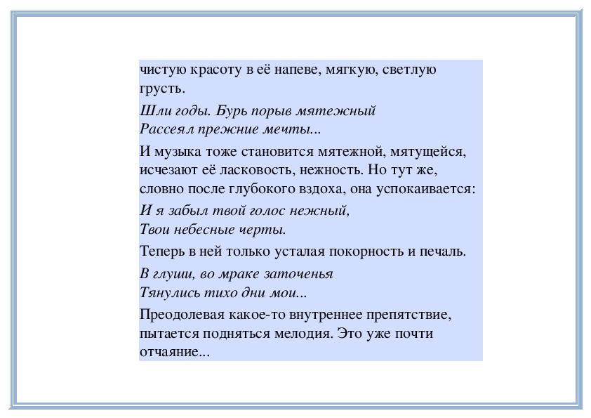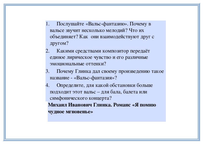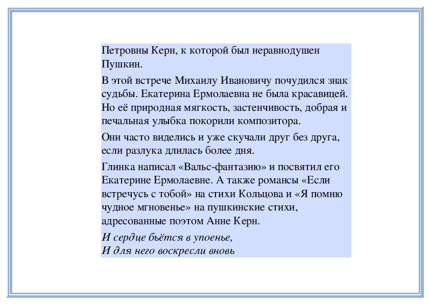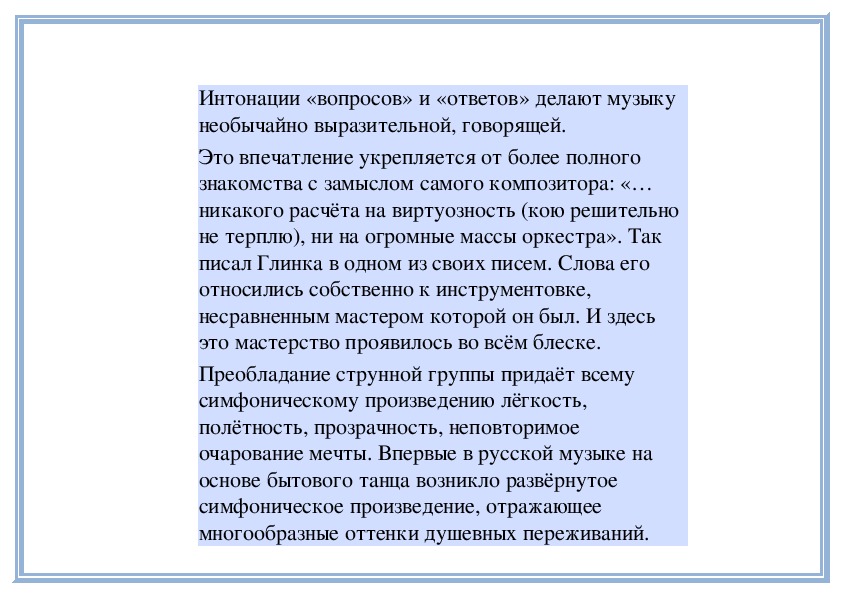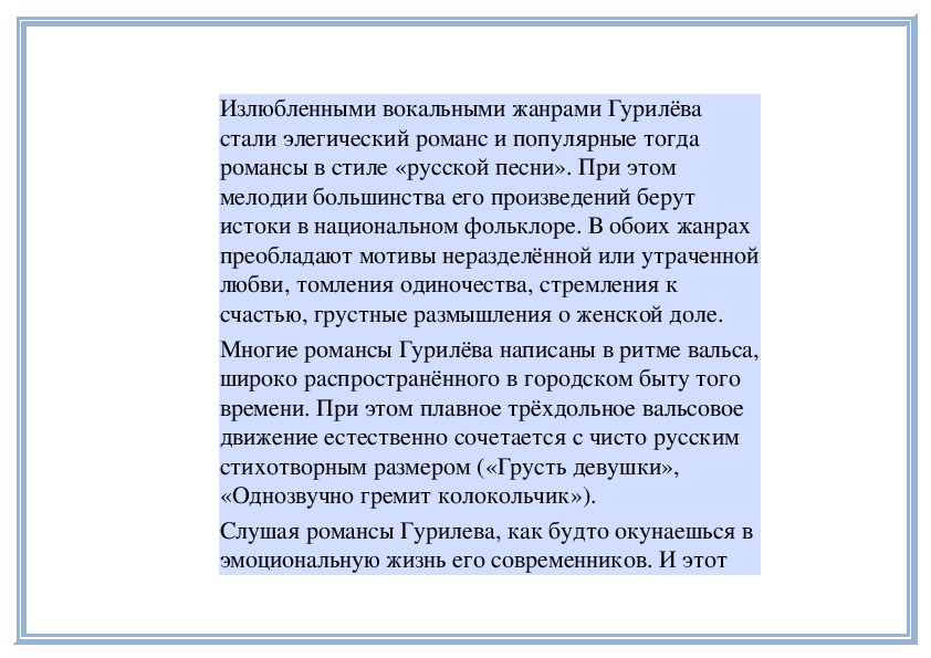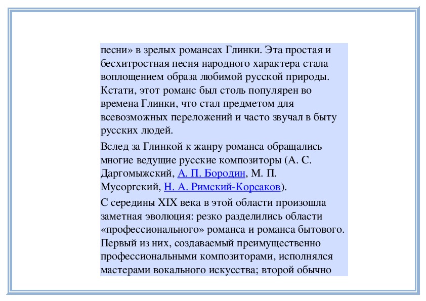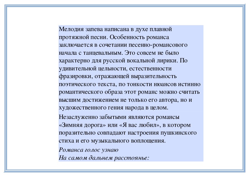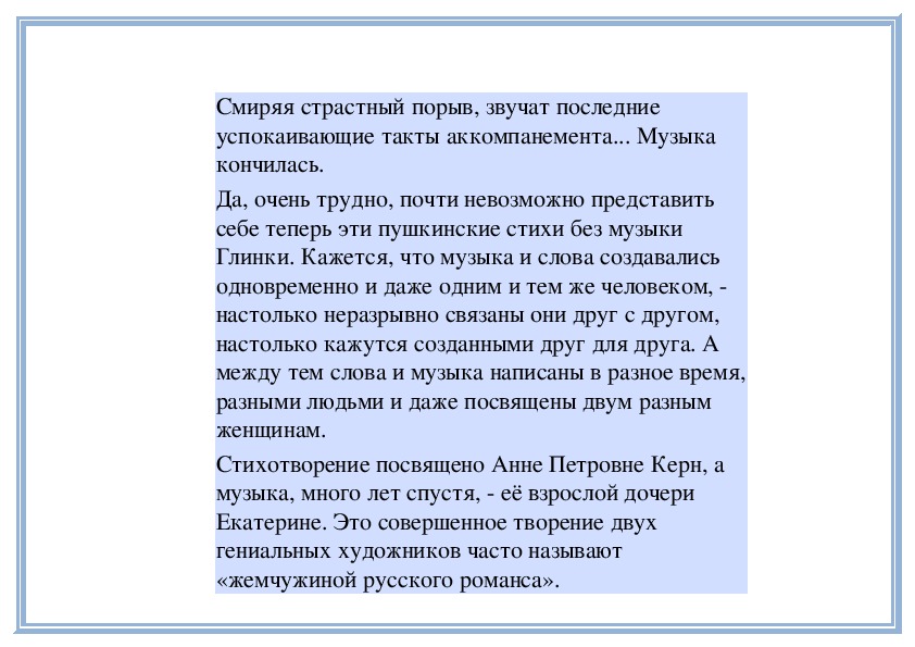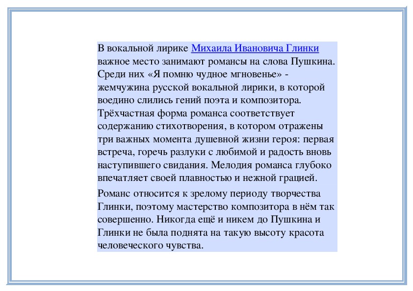 является одним из немногих образцов «русскойпесни» в зрелых романсах Глинки. Эта простая и