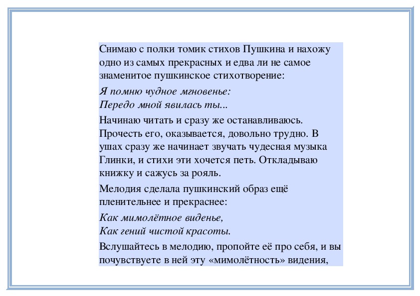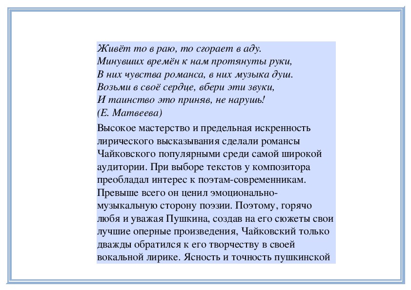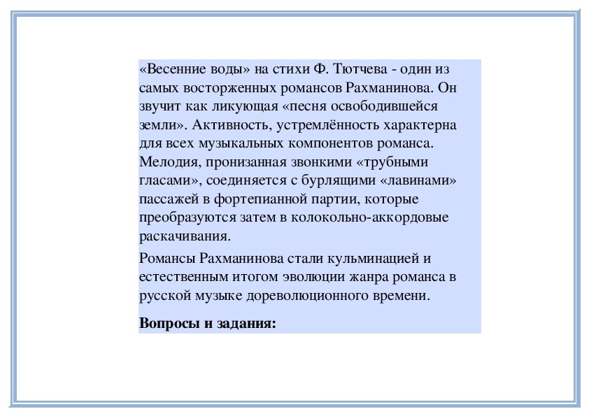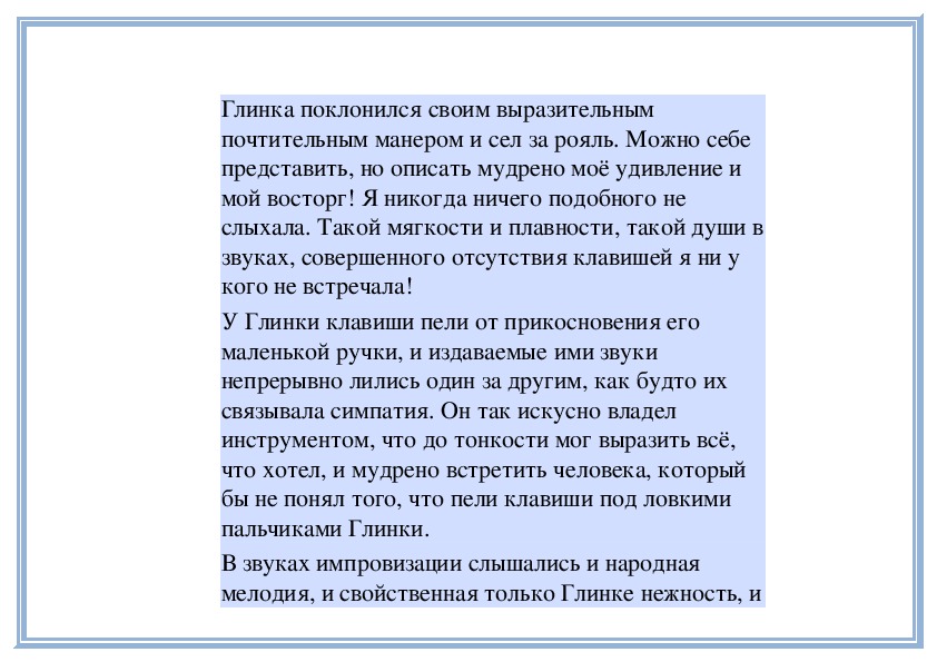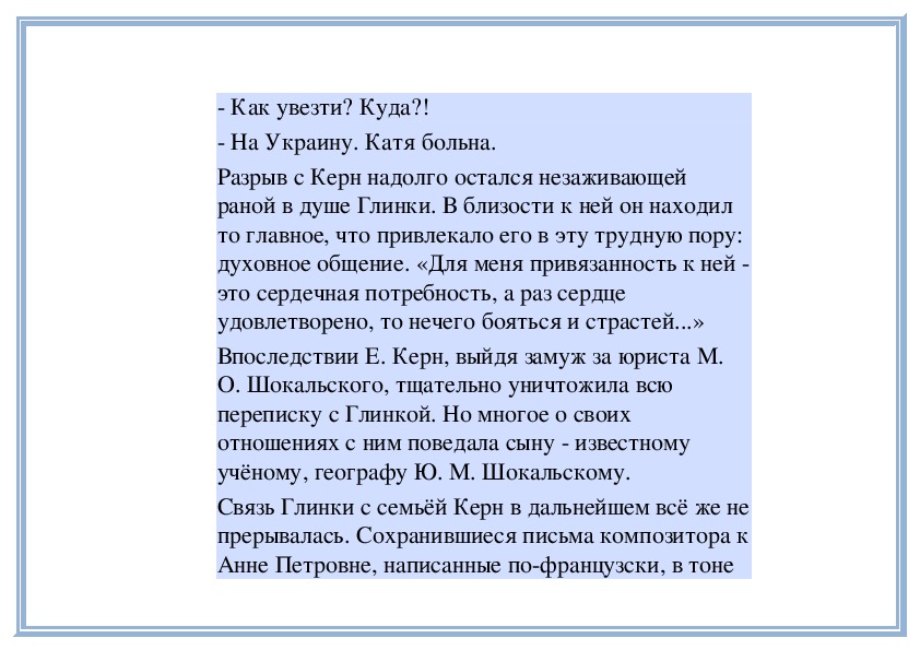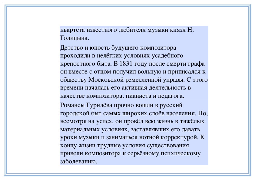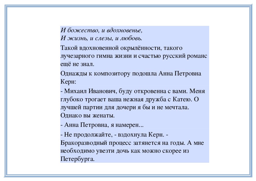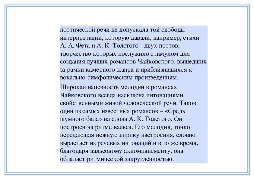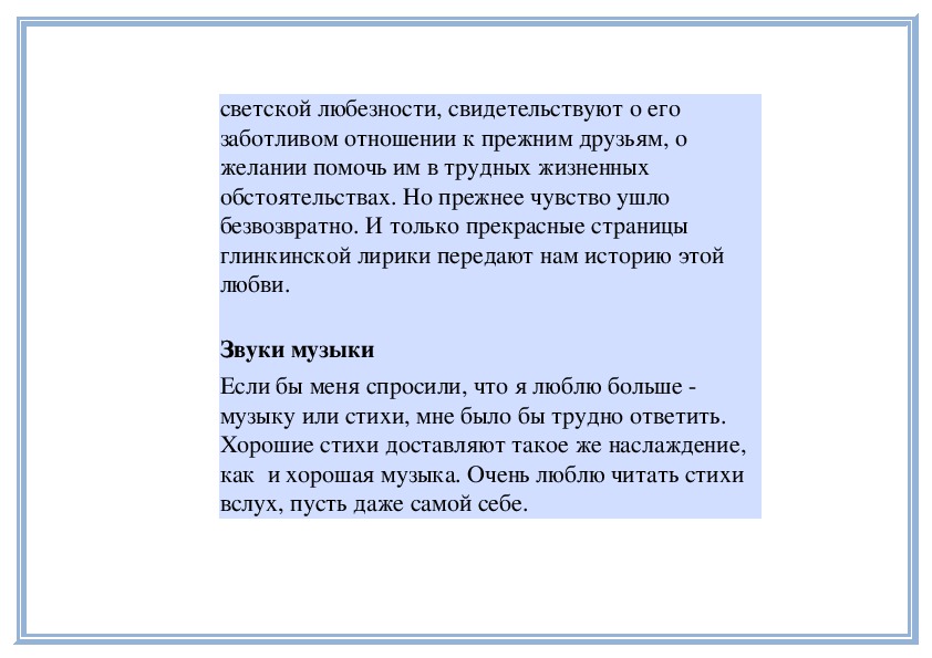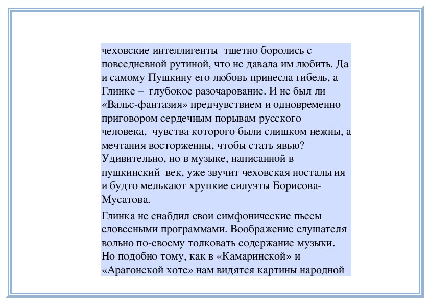 является одним из немногих образцов «русскойпесни» в зрелых романсах Глинки. Эта простая и