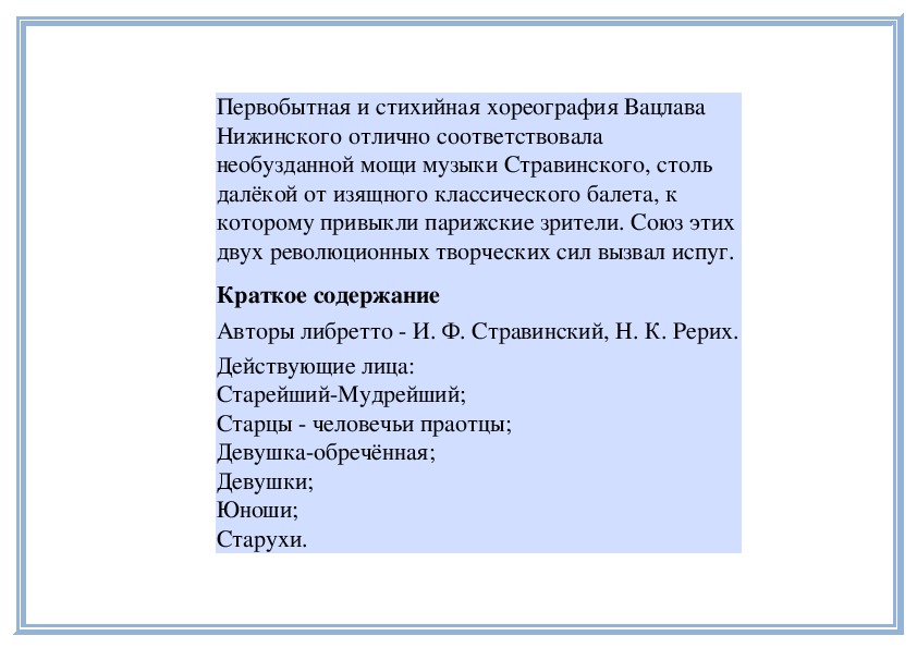 Авторы либретто И. Ф. Стравинский, Н. К. Рерих.