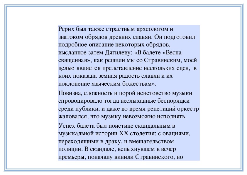 Дягилев, обладавший безошибочным музыкальным чутьём, заинтересовался произведением. Заинтересовался необычным сочинением и друг Стравинского, художник Николай Рерих,- он осуществил сценографию для представления.