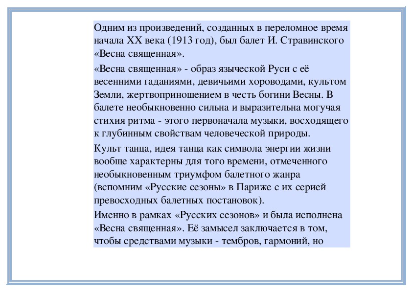 «Кащей Бессмертный» и «Золотой петушок» Н. Римского-Корсакова, «Баба Яга» и «Волшебное озеро» А. Лядова, «Жар-птица» и «Весна священная» И. Стравинского, «Замок Синей Бороды» Б. Бартока, «Дафнис и Хлоя» М. Равеля - вот далеко не полный перечень произведений, определивших музыкальное направление первой четверти ХХ столетия.
