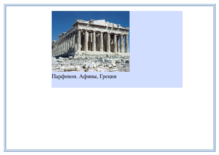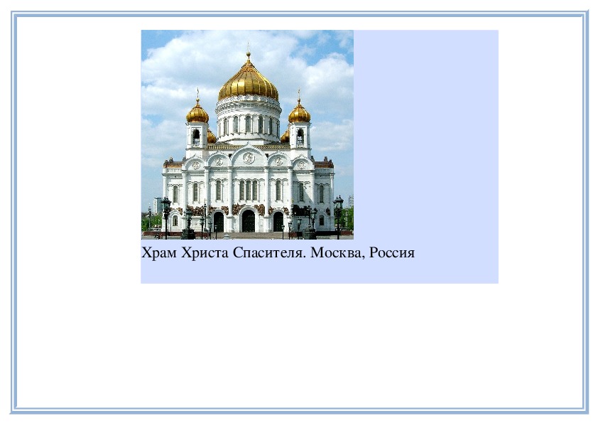 украшениями.Храм Христа Спасителя. Москва, РоссияПарфенон. Афины, ГрецияМавзолей ТаджМахал. ИндияСобор НотрДам. Монреаль, Канада