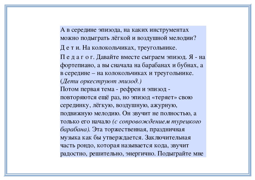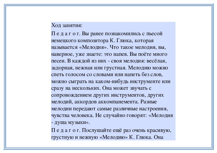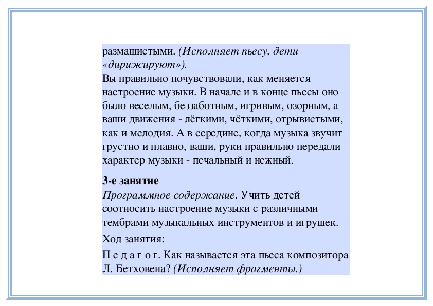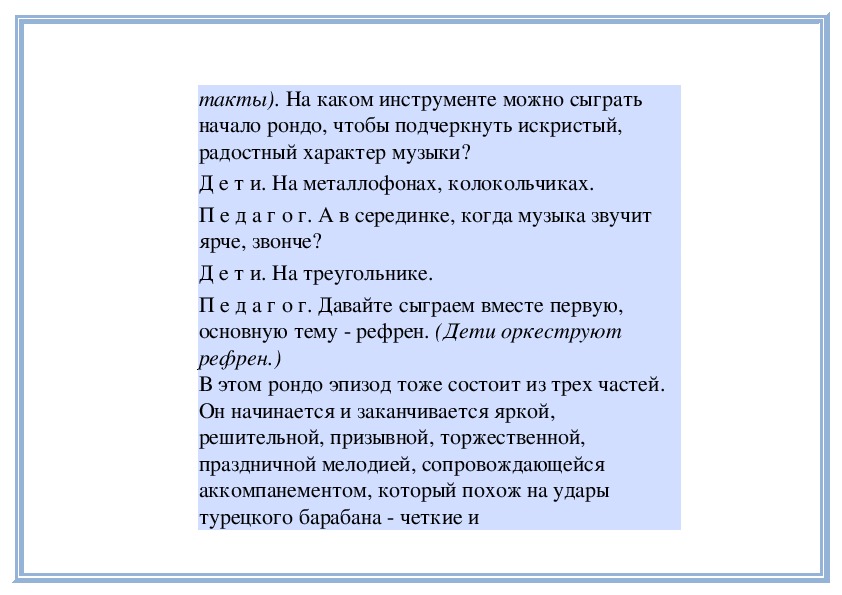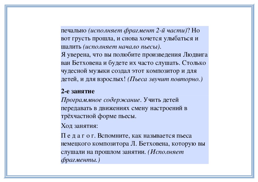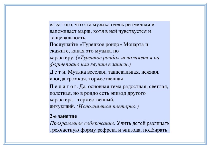 Ход занятия:П е д а г о г. Вы ознакомились с сонатой ре мажор