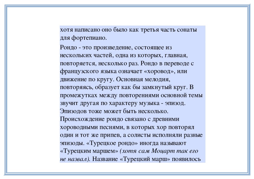 П е д а г о г. Мелодия, которую вы сейчас услышите, любима многими людьми. Она очень известна и популярна во всем мире. «Турецкое рондо» Вольфганга Амадея Моцарта привлекает красотой мелодий, изяществом, блеском. В этом произведении В. А. Моцарт изобразил удары большого турецкого барабана, неизвестного в те времена в Европе. «Турецкое рондо» («Rondo alla turca») часто звучит в виде самостоятельной пьесы, хотя написано оно было как третья часть сонаты для фортепиано.