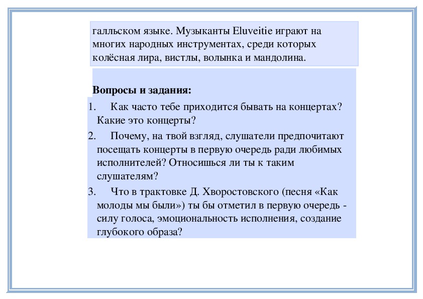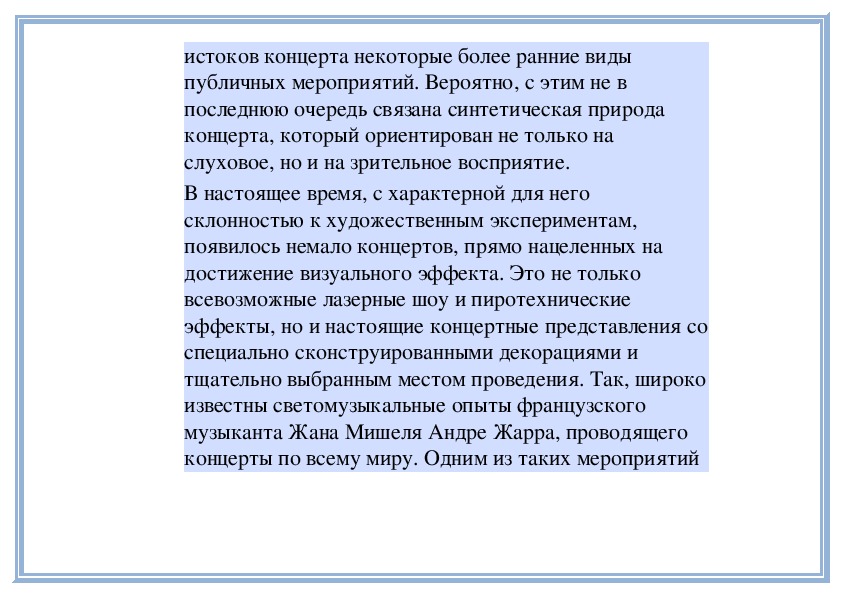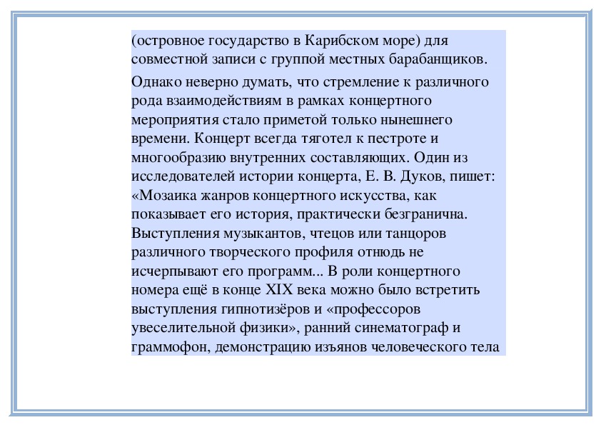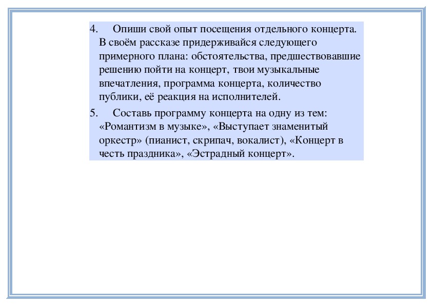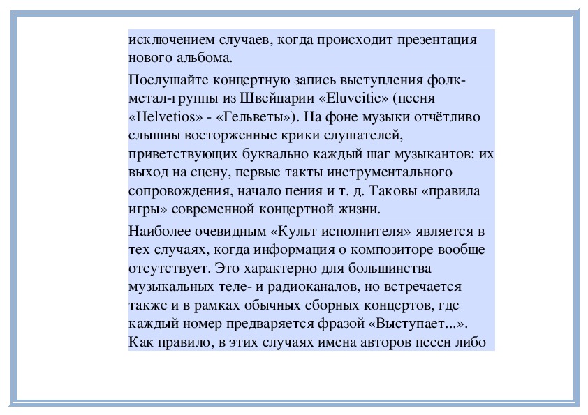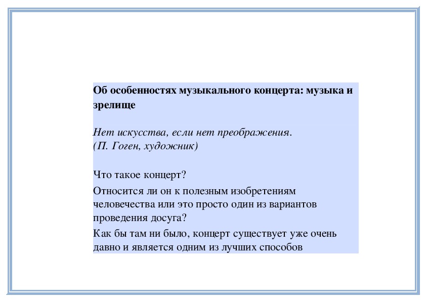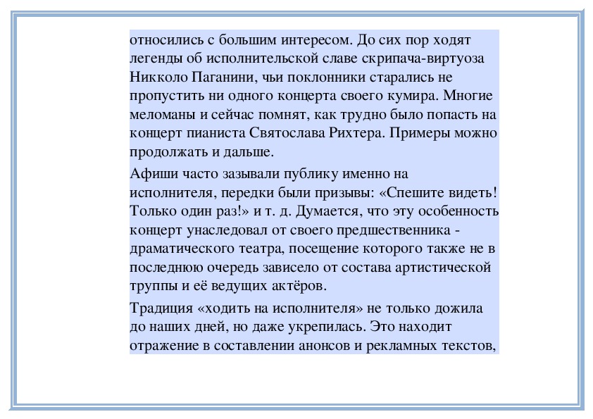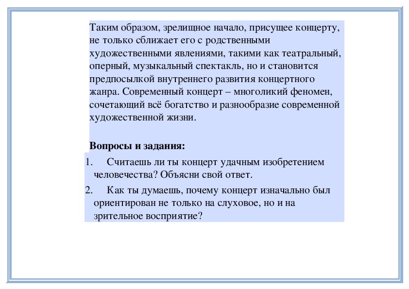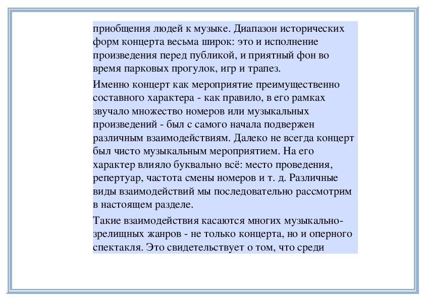 Во все времена слушатели, посещая концерты, стремились вырваться из однообразия будней, провести время с большим удовольствием и в приятном обществе. Концерт изначально был чем-то необычным - и при этом не особенно обременительным; как и всякое утончённое наслаждение, он не требовал чрезмерного напряжения ума.