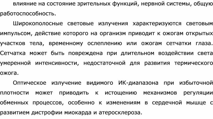 Оптическое излучение видимого ИК‑диапазона при избыточной плотности может приводить к истощению механизмов регуляции обменных процессов, особенно к изменениям в сердечной мышце с развитием дистрофии миокарда и атеросклероза.