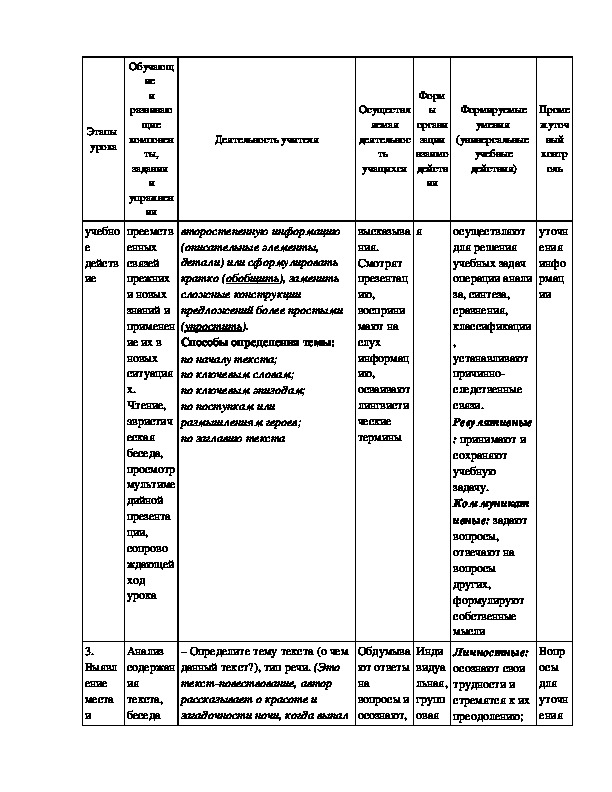Обучать лингвистическому и содержательному анализу текста; учить соотносить выбор языковых средств, использованных в тексте; определять систему языковых средств, использованных в тексте; помочь понять его идею, композицию, роль художественной детали; развивать творческие возможности школьников