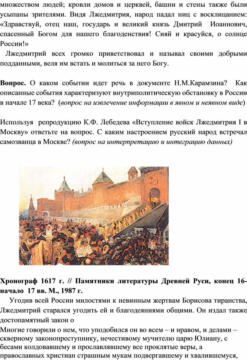 Вопрос. О каком событии идет речь в документе Н.М.Карамзина?  Как описанные события характеризуют внутриполитическую обстановку в России в начале 17 века?  (вопрос на извлечение информации в явном и неявном виде)