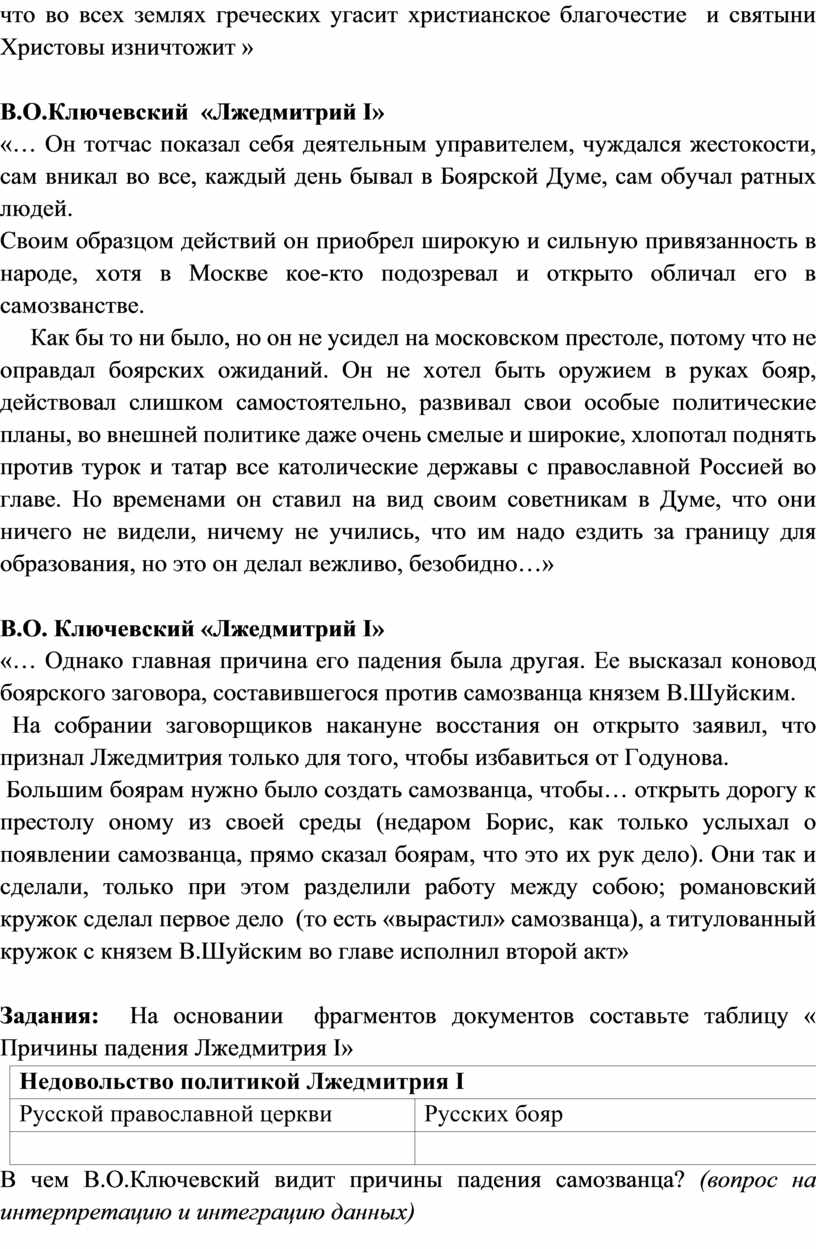 Задания:  На основании  фрагментов документов составьте таблицу « Причины падения Лжедмитрия I»