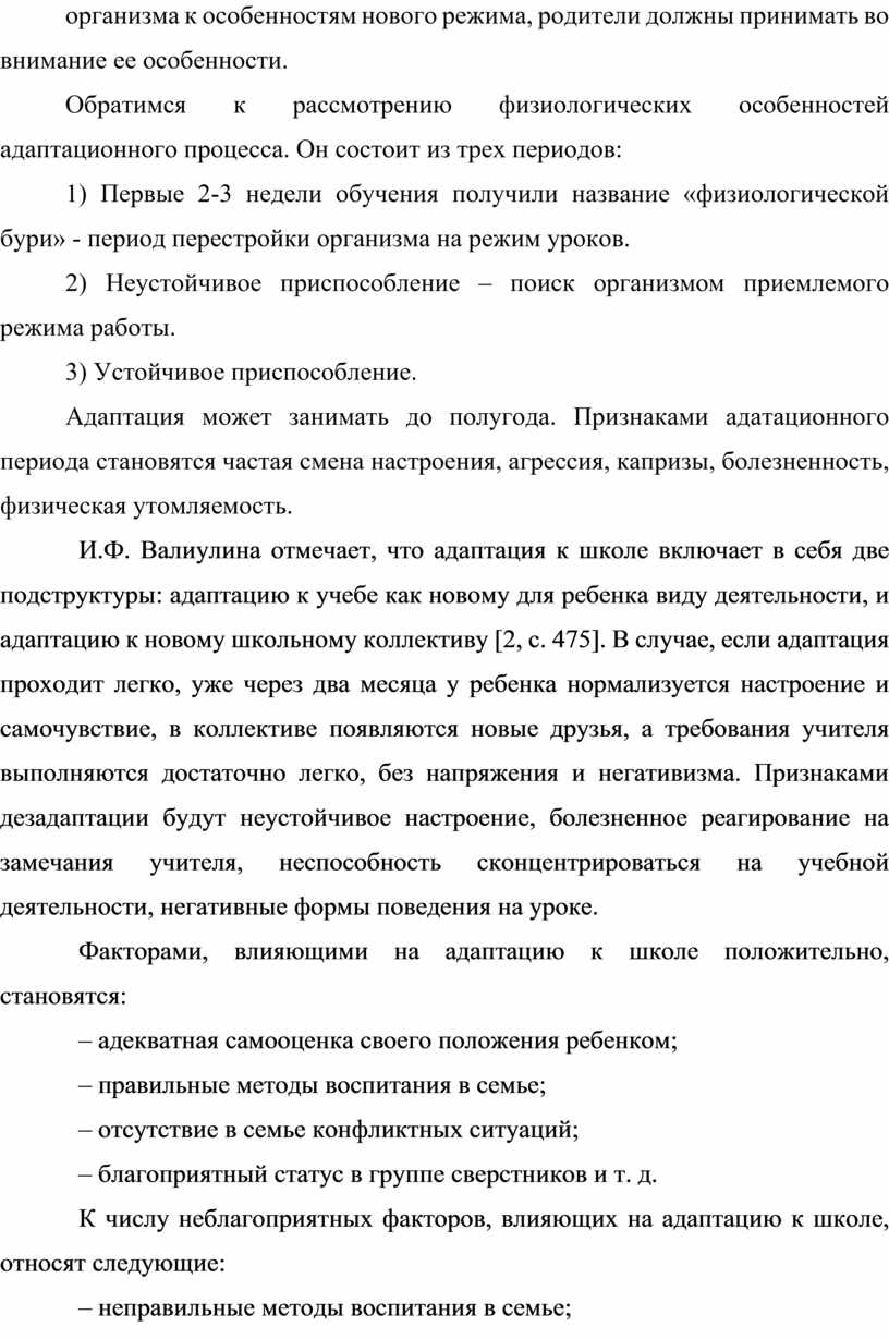 2. Валиулина, И. Ф. Особенности адаптации первоклассников к школе / И. Ф. Валиулина // Молодой ученый. — 2017. — № 5 (139). — С. 474-477.