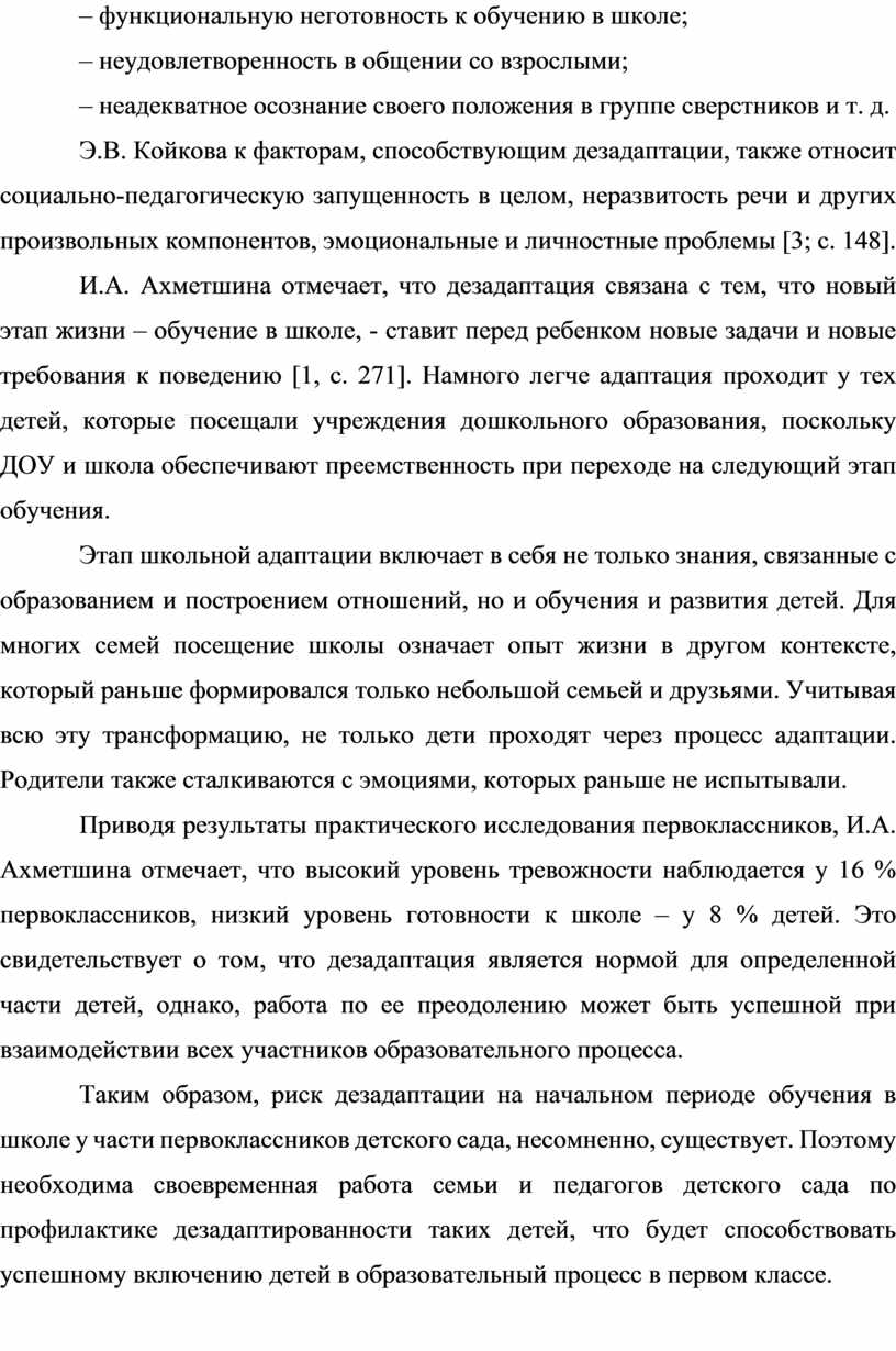 Приводя результаты практического исследования первоклассников, И.А. Ахметшина отмечает, что высокий уровень тревожности наблюдается у 16 % первоклассников, низкий уровень готовности к школе – у 8 % детей. Это свидетельствует о том, что дезадаптация является нормой для определенной части детей, однако, работа по ее преодолению может быть успешной при взаимодействии всех участников образовательного процесса.