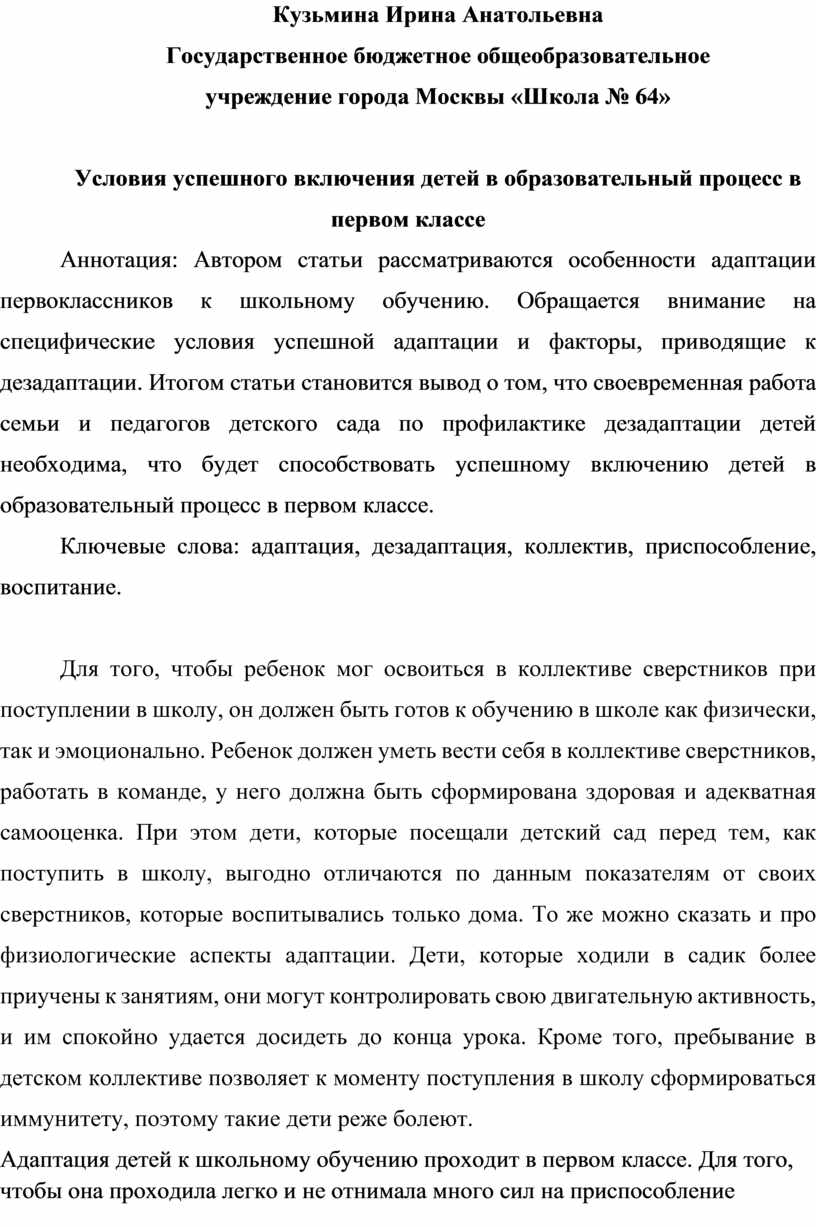 Аннотация: Автором статьи рассматриваются особенности адаптации первоклассников к школьному обучению. Обращается внимание на специфические условия успешной адаптации и факторы, приводящие к дезадаптации. Итогом статьи становится вывод о том, что своевременная работа семьи и педагогов детского сада по профилактике дезадаптации детей необходима, что будет способствовать успешному включению детей в образовательный процесс в первом классе.