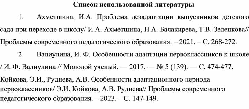 1. Ахметшина, И.А. Проблема дезадаптации выпускников детского сада при переходе в школу/ И.А. Ахметшина, Н.А. Балакирева, Т.В. Зеленкова// Проблемы современного педагогического образования. – 2021. – С. 268-272.