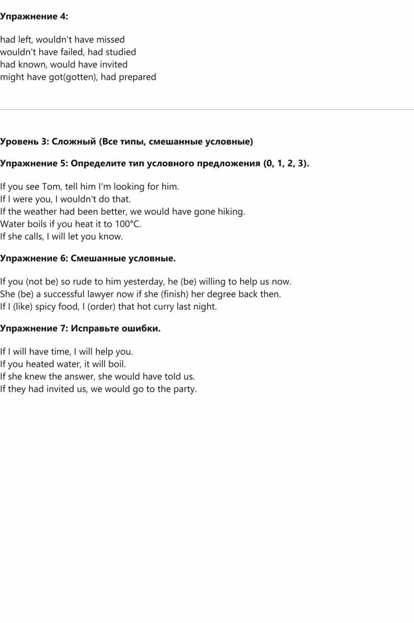Давайте систематизируем условные предложения (Conditionals) в английском языке от простого к сложному, с объяснениями и упражнениями с ответами.