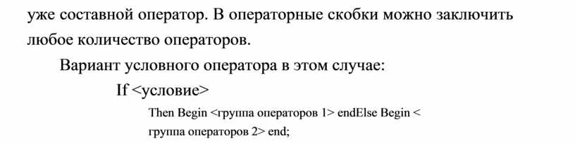После слов then и else стоит только один оператор. Но что делать, если требуется по выполнению или невыполнению условия совершить не одно, а несколько действий? Здесь приходит на помощь
