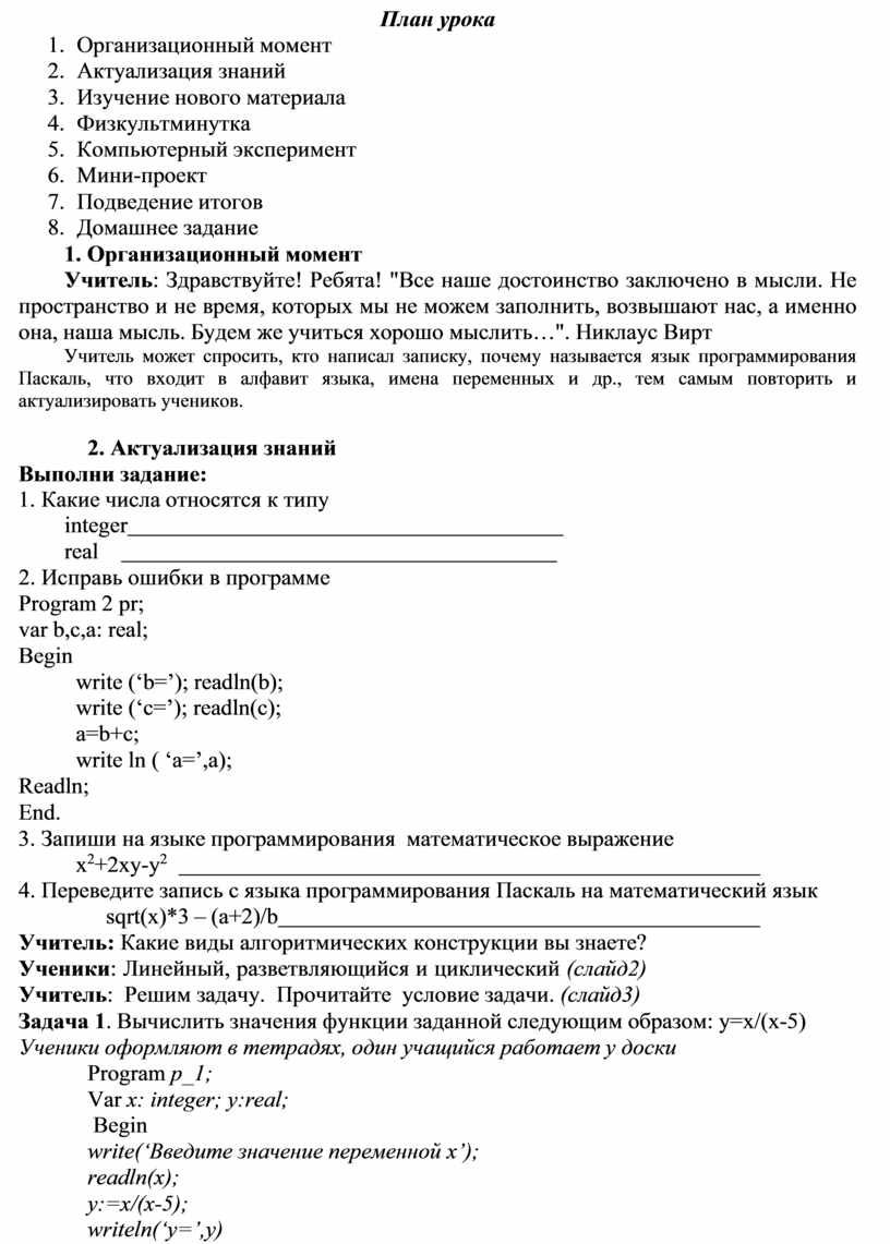 Учитель может спросить, кто написал записку, почему называется язык программирования Паскаль, что входит в алфавит языка, имена переменных и др., тем самым повторить и актуализировать учеников.