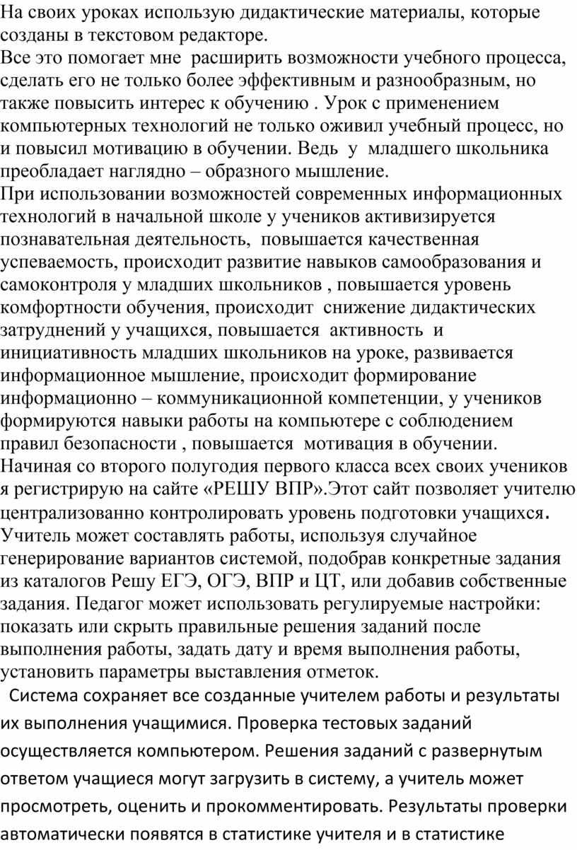 Одной из главных задач учителей начальной школы является развитие у детей интереса к учению, творчеству. Если ребенок заинтересован учебным процессом, то он более глубоко познает предмет и у него происходит развитие способностей. Применение различных информационных коммуникационных технологий (ИКТ) в учебном процессе начальной школы позволяет разнообразить формы и средства обучения, повышать творческую активность учащихся. С помощью MS Word я разрабатываю проверочные тексты, контрольные задания, карточки, анкеты и т.д. На своих уроках использую дидактические материалы, которые созданы в текстовом редакторе.