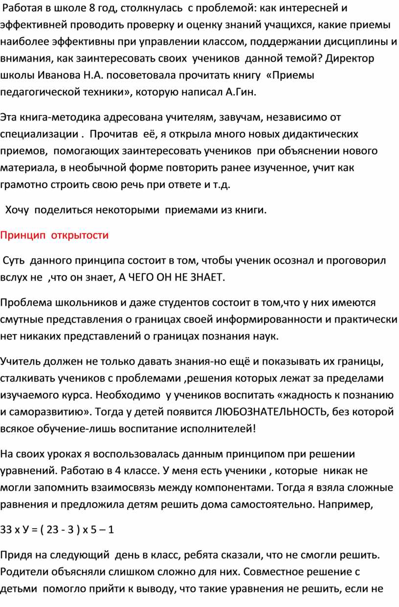 Работая в школе 8 год, столкнулась с проблемой: как интересней и эффективней проводить проверку и оценку знаний учащихся, какие приемы наиболее эффективны при управлении классом, поддержании дисциплины и внимания, как заинтересовать своих учеников данной темой? Директор школы Иванова Н.А. посоветовала прочитать книгу «Приемы педагогической техники», которую написал А.Гин.