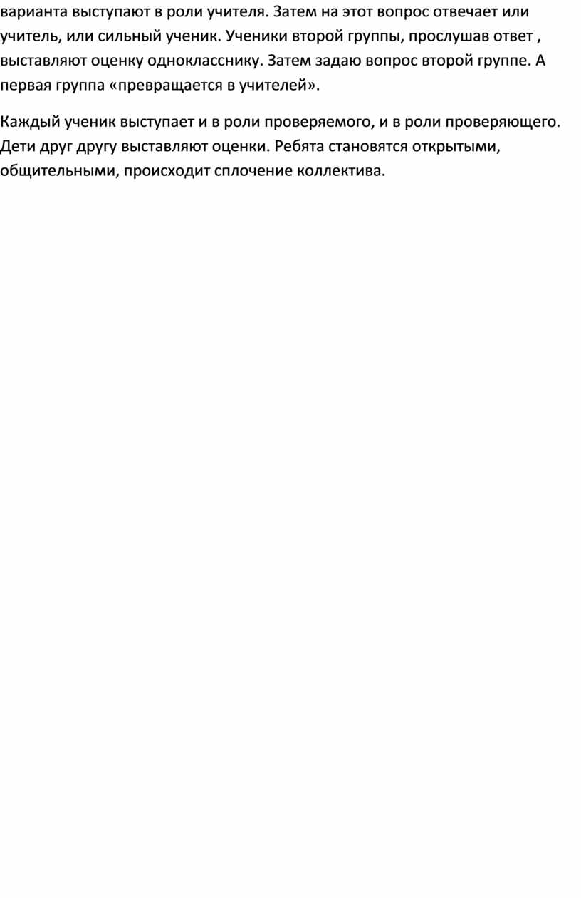 Каждый ученик выступает и в роли проверяемого, и в роли проверяющего. Дети друг другу выставляют оценки. Ребята становятся открытыми, общительными, происходит сплочение коллектива.