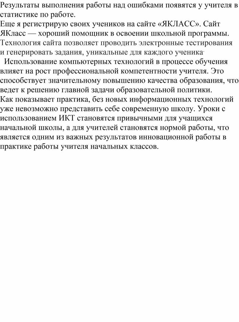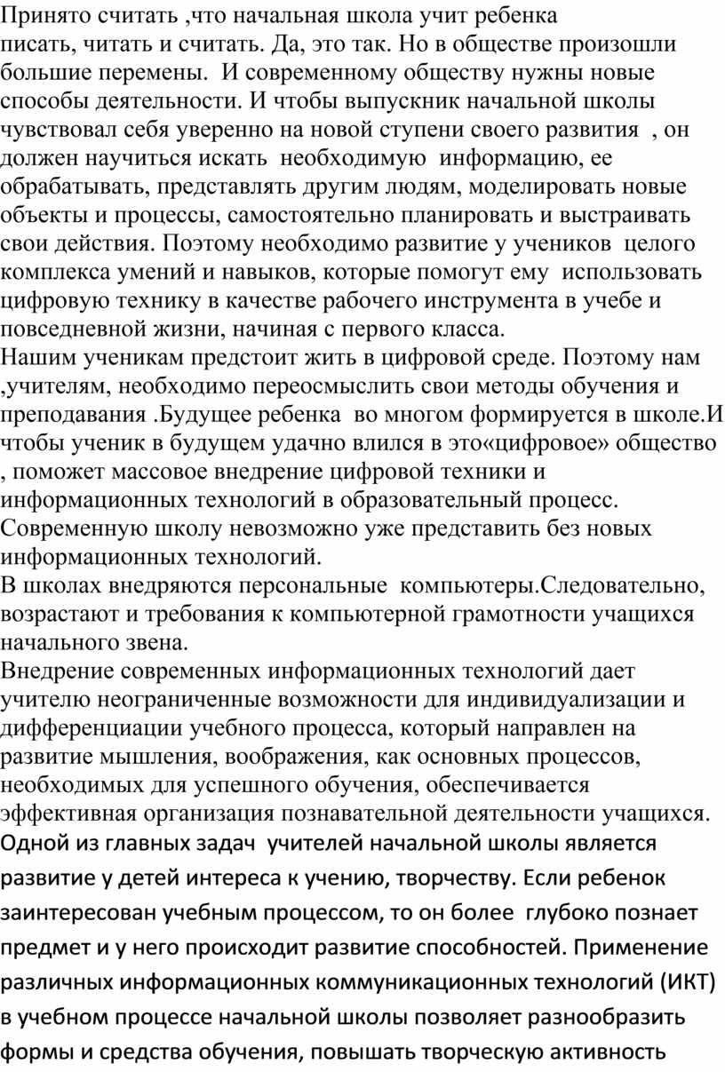 Как показывает практика, без новых информационных технологий уже невозможно представить себе современную школу. Уроки с использованием ИКТ становятся привычными для учащихся начальной школы, а для учителей становятся нормой работы, что является одним из важных результатов инновационной работы в практике работы учителя начальных классов.