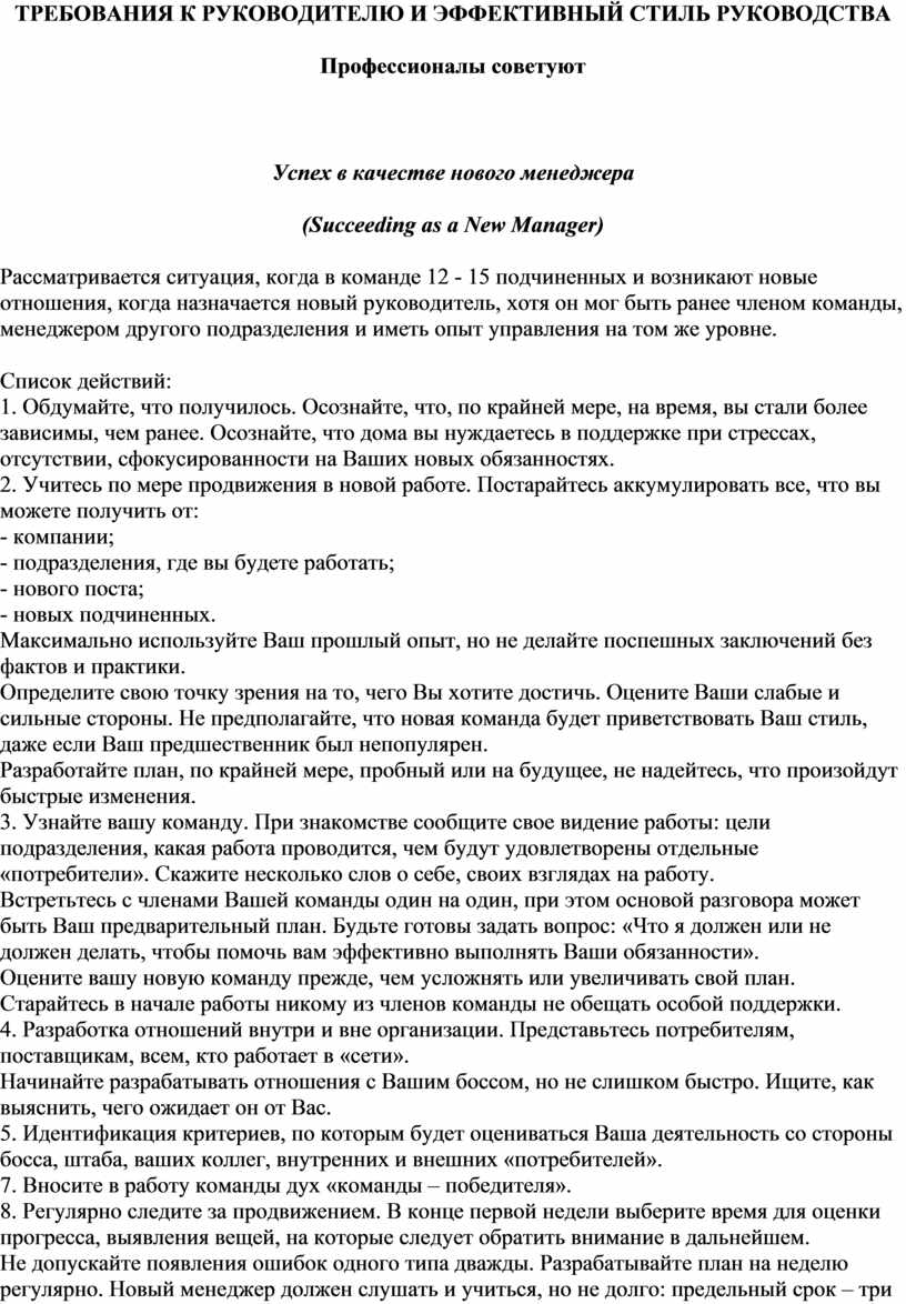 ТРЕБОВАНИЯ К РУКОВОДИТЕЛЮ И ЭФФЕКТИВНЫЙ СТИЛЬ РУКОВОДСТВА
