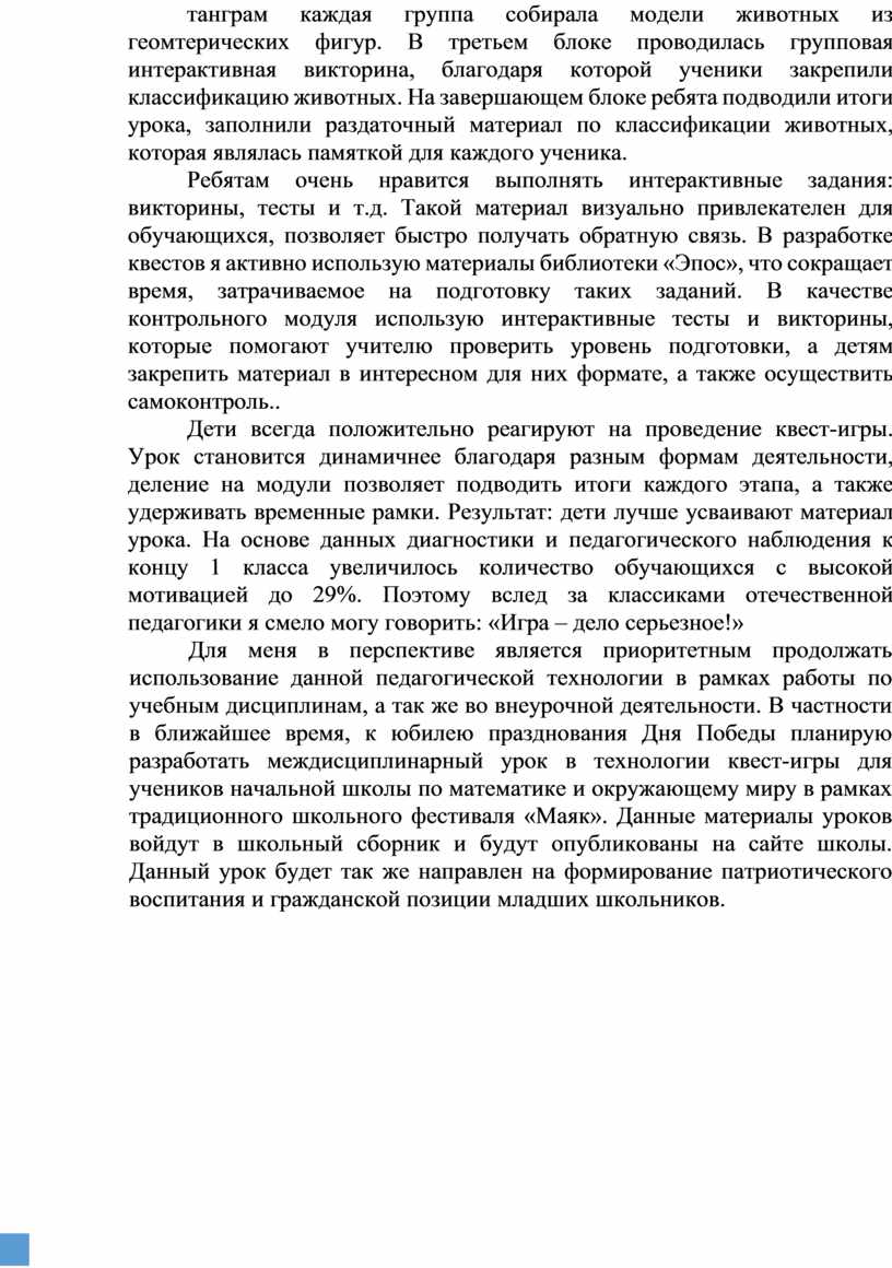 Я провожу квесты по разным предметам. Например, на уроке окружающего мира была организована квест-игра для первого класса по теме «Дикие и домашние животные». В первом блоке ученики собирали мозайку из картинок животных, определили их названия, разделили по группам на диких и домашних жиовтных. Во втором блоке в технике танграм каждая группа собирала модели животных из геомтерических фигур. В третьем блоке проводилась групповая интерактивная викторина, благодаря которой ученики закрепили классификацию животных. На завершающем блоке ребята подводили итоги урока, заполнили раздаточный материал по классификации животных, которая являлась памяткой для каждого ученика.