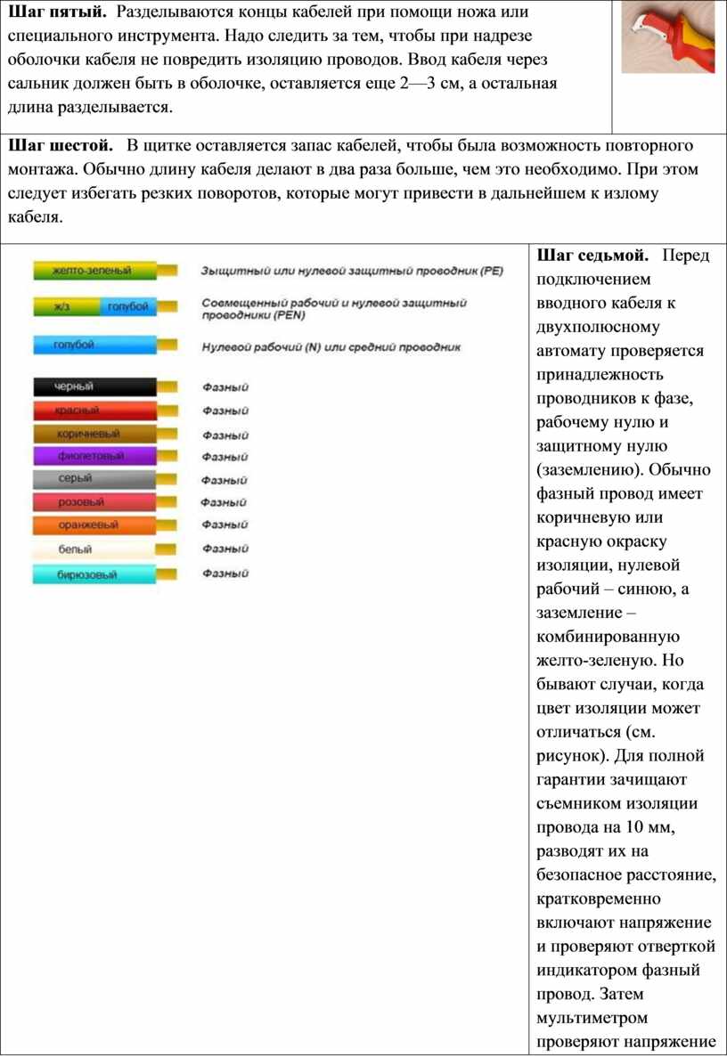 Шаг седьмой. Перед подключением вводного кабеля к двухполюсному автомату проверяется принадлежность проводников к фазе, рабочему нулю и защитному нулю (заземлению). Обычно фазный провод имеет коричневую или красную окраску изоляции, нулевой рабочий – синюю, а заземление – комбинированную желто-зеленую. Но бывают случаи, когда цвет изоляции может отличаться (см. рисунок). Для полной гарантии зачищают съемником изоляции провода на 10 мм, разводят их на безопасное расстояние, кратковременно включают напряжение и проверяют отверткой индикатором фазный провод. Затем мультиметром проверяют напряжение между фазным проводом, рабочим и защитным нулем. Оно должно составлять 220—230 В. После этого напряжение отключают. |