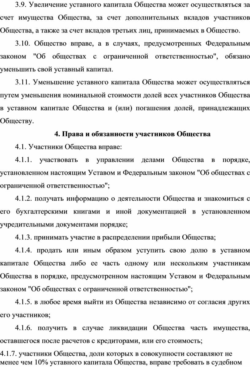 3.10. Общество вправе, а в случаях, предусмотренных Федеральным законом "Об обществах с ограниченной ответственностью", обязано уменьшить свой уставный капитал.