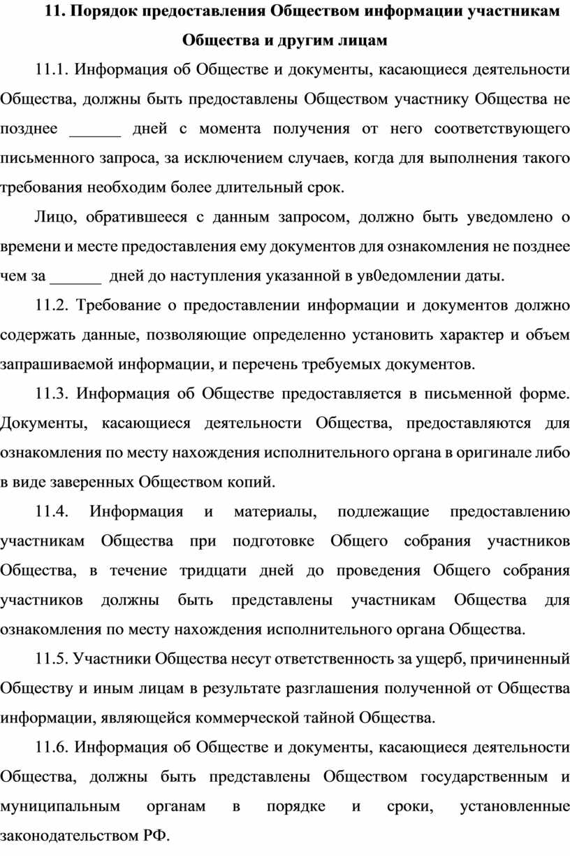11.1. Информация об Обществе и документы, касающиеся деятельности Общества, должны быть предоставлены Обществом участнику Общества не позднее ______ дней с момента получения от него соответствующего письменного запроса, за исключением случаев, когда для выполнения такого требования необходим более длительный срок.
