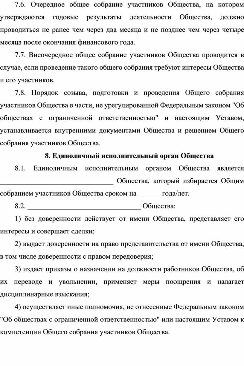 7.8. Порядок созыва, подготовки и проведения Общего собрания участников Общества в части, не урегулированной Федеральным законом "Об обществах с ограниченной ответственностью" и настоящим Уставом, устанавливается внутренними документами Общества и решением Общего собрания участников Общества.
