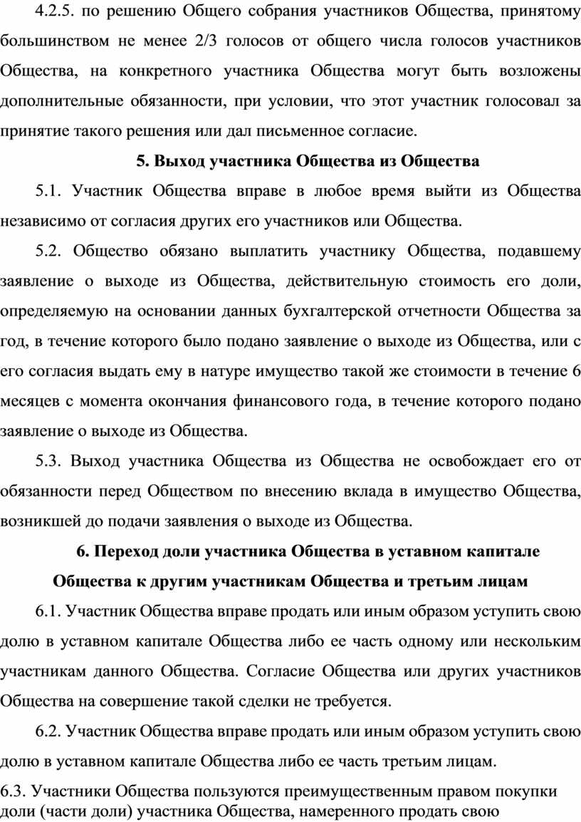 5.3. Выход участника Общества из Общества не освобождает его от обязанности перед Обществом по внесению вклада в имущество Общества, возникшей до подачи заявления о выходе из Общества.